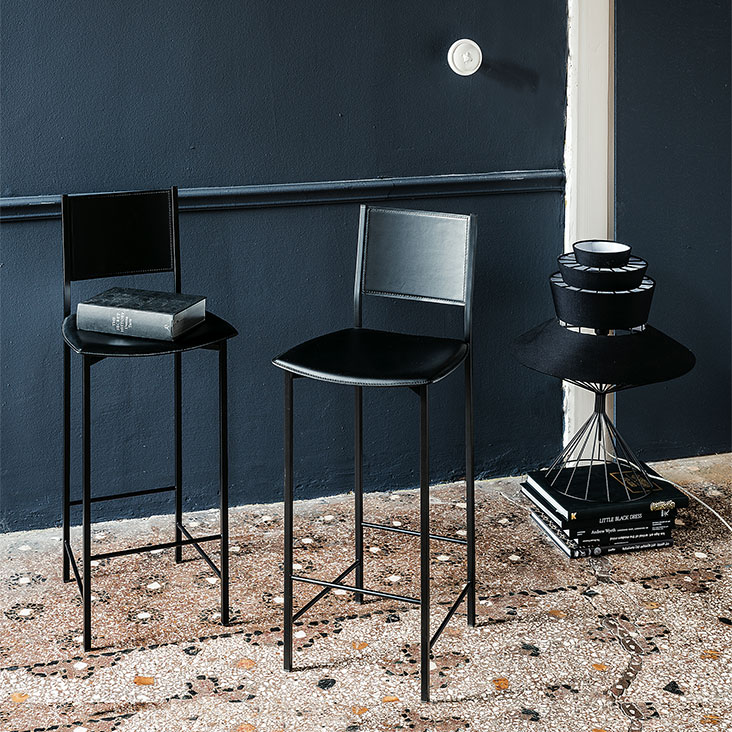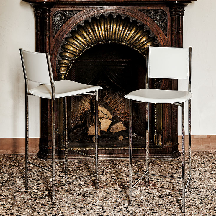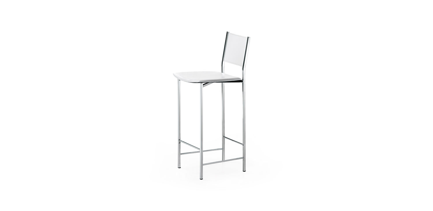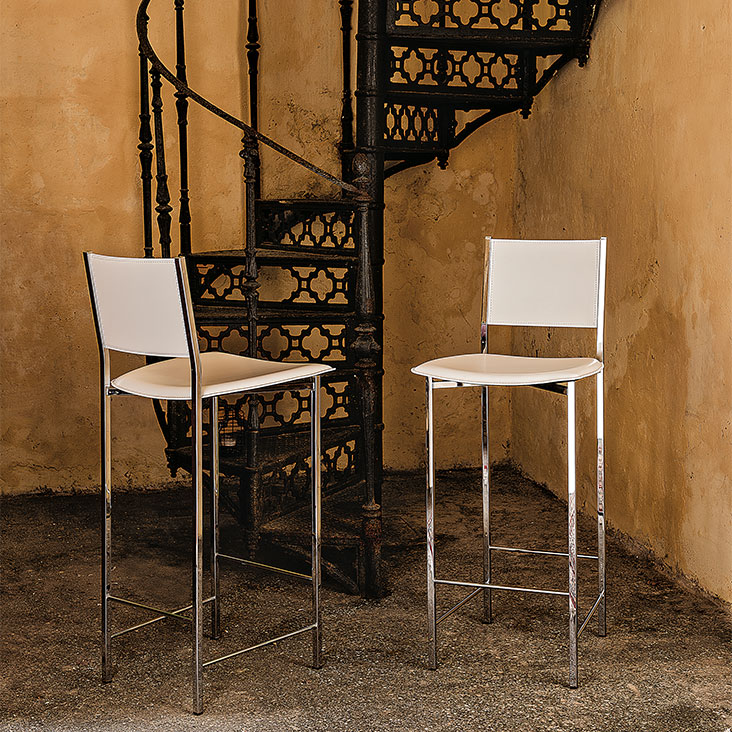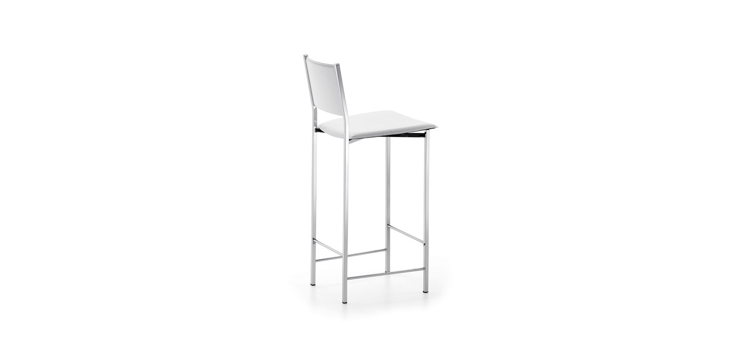 Stool with chromed (08) steel structure. Removable cover in fabric or fix cover in soft leather, synthetic nubuck, micro nubuck or synthetic leather, as per sample card.