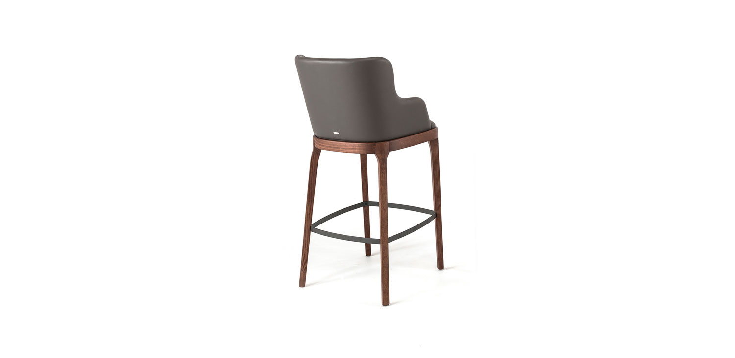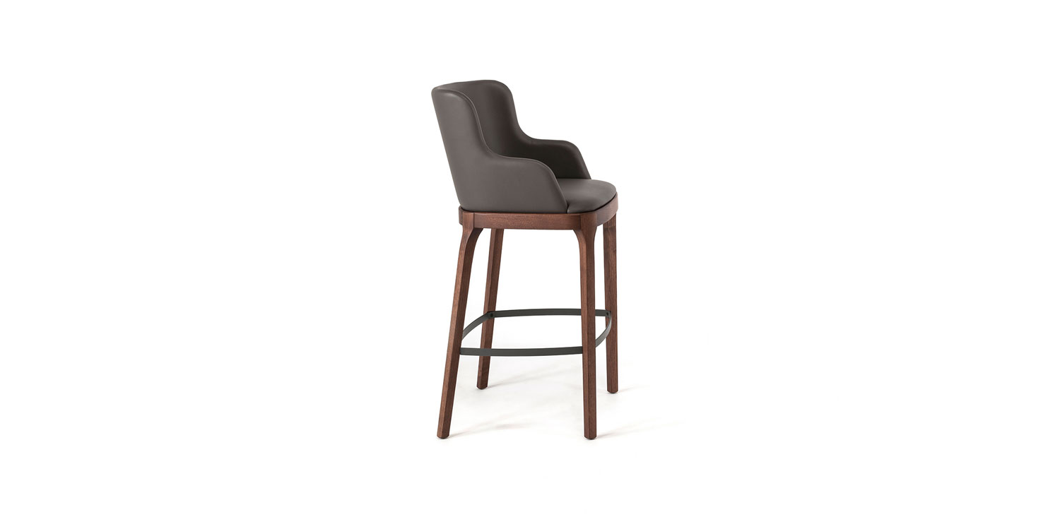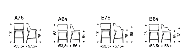 Stool with or without arms with frame in natural ashwood (frN), Canaletto walnut stained ashwood (frNC), burned oak stained ashwood (frRB), open pore matt white (fr71) or black (fr73) painted ashwood. Seat and back upholstered in fabric, synthetic nubuck, micro nubuck, synthetic leather or soft leather as per sample card. The cover is not removable.