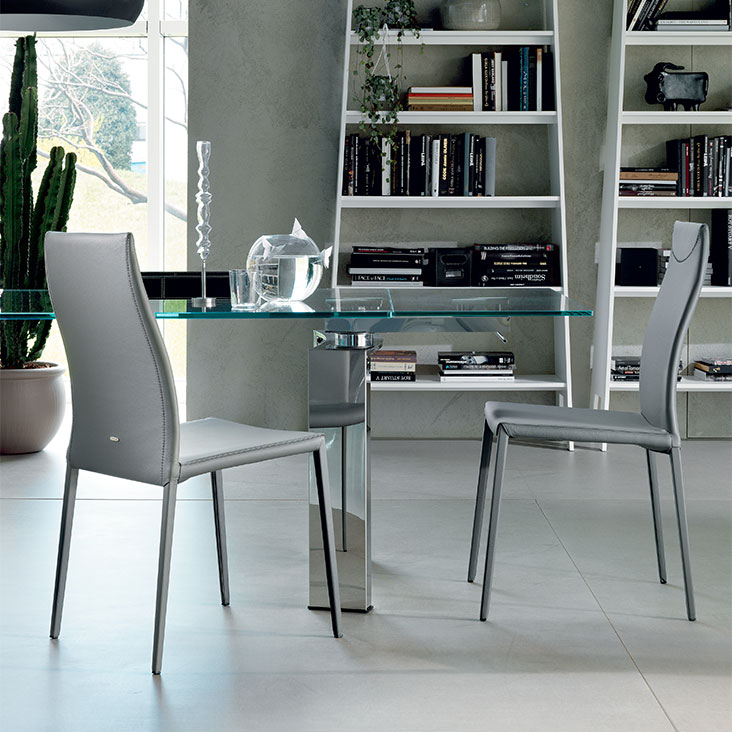 Chair with steel frame completely upholstered in fabric, synthetic nubuck, micro nubuck, synthetic leather or soft leather as per sample card. The soft leather, synthetic nubuck, micro nubuck and synthetic leather covers are not removable. Flexible back rest.