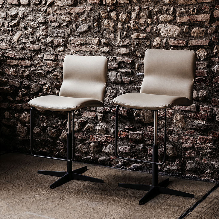 Swiveling ultralight stool, adjustable in height with 4 spokes base in polished aluminium and column, footrest and gas piston in chromed steel (08) or with base plate, column, and footrest in black (GFM73) or titanium (GFM11) embossed lacquered steel and gas piston in chromed steel (08). Frame covered in fabric, synthetic nubuck, micro nubuck, synthetic leather, or soft leather as per sample card. -- The new lowered piston allows the use of the stool as a chair --