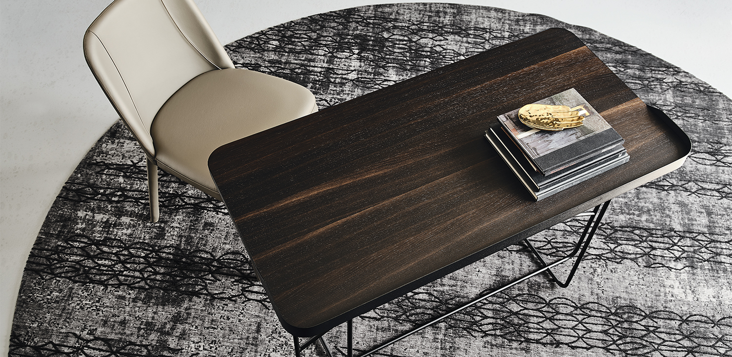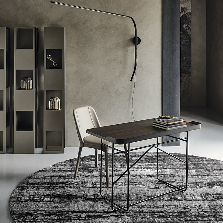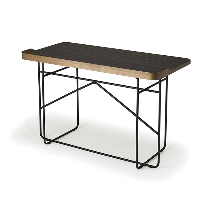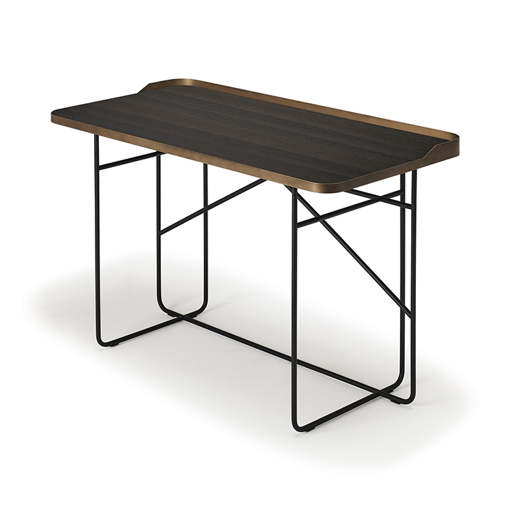 Desk with base and top frame in titanium (GFM11) or black (GFM73) embossed lacquered steel, or with base in black (GFM73) embossed lacquered steel and Brushed Bronze top frame. Top in Canaletto walnut (NC) or burned oak (RB).