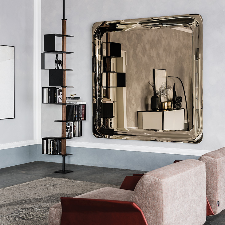 Wall or floor mirror with the whole frame in mirrored, smoked grey or bronze mirrored glass. Mirror is equipped with plates for both horizontal and vertical installation.