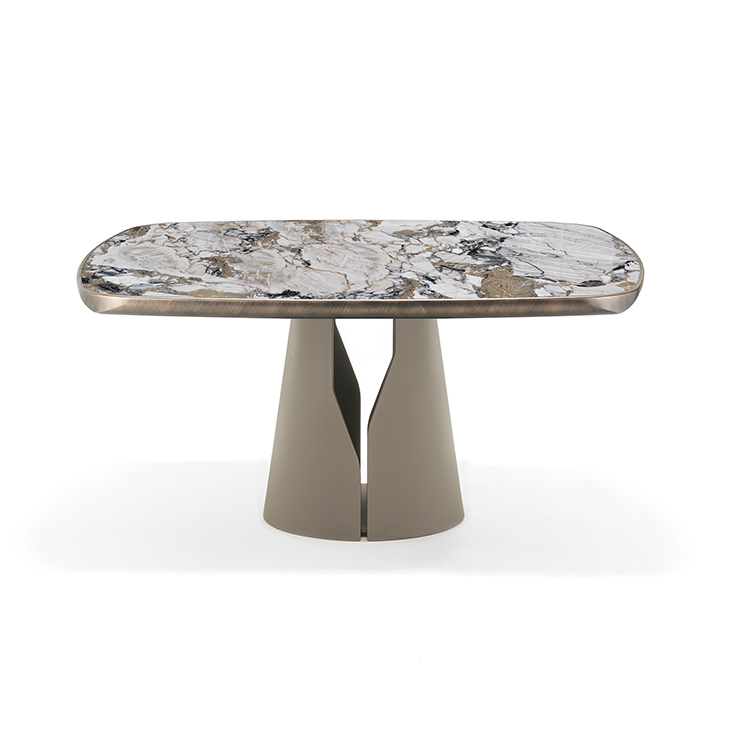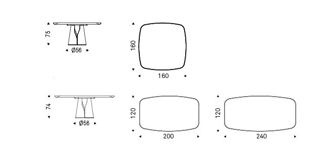 Table with base in titanium (GFM11), bronze (GFM18), graphite (GFM69), white (GFM71) or black (GFM73) embossed lacquered steel. Top in ceramic Marmi Calacatta (KM01), Alabastro (KM02), Ardesia (KM04), matt Golden Calacatta (KM05), glossy Golden Calacatta (KM06), matt Portoro (KM07), glossy Portoro (KM08), glossy Sahara Noir (KM09), Emperador (KM10), Makalu (KM11), Breccia (KM12) or Arenal (KM13) with Brushed Bronze or Brushed Grey lacquered and rounded lower profile. 6cm thick wooden top on 160x160 version and 5cm on 200x120 and 240x120 versions.