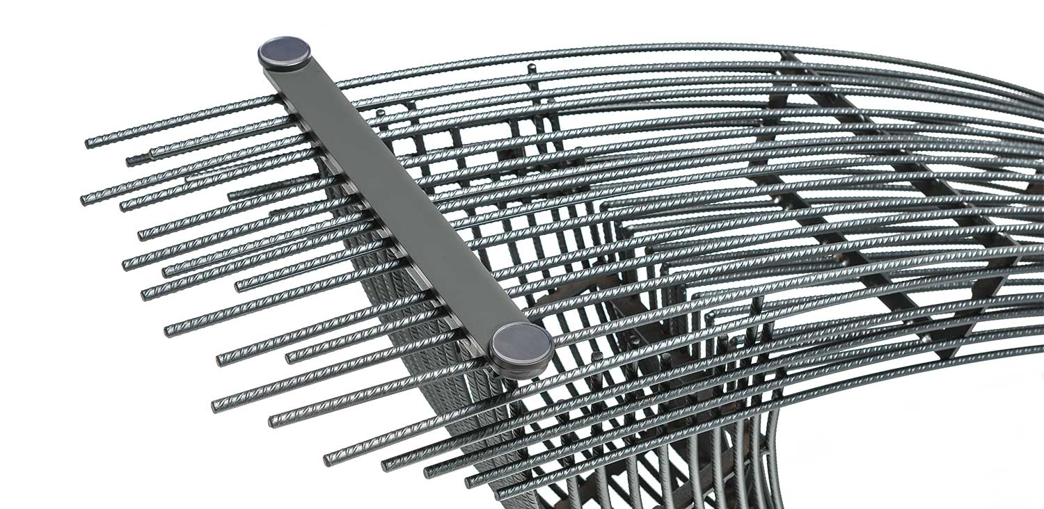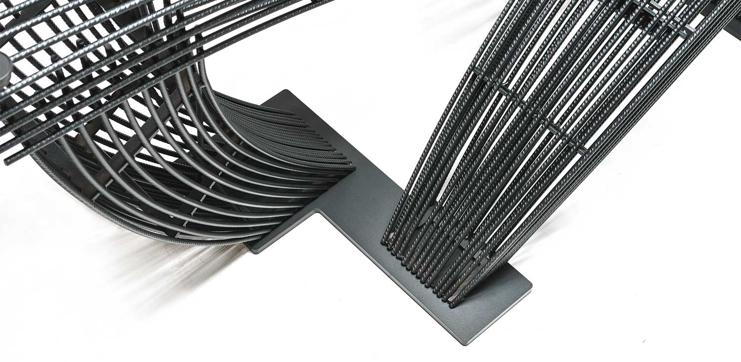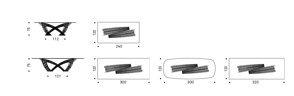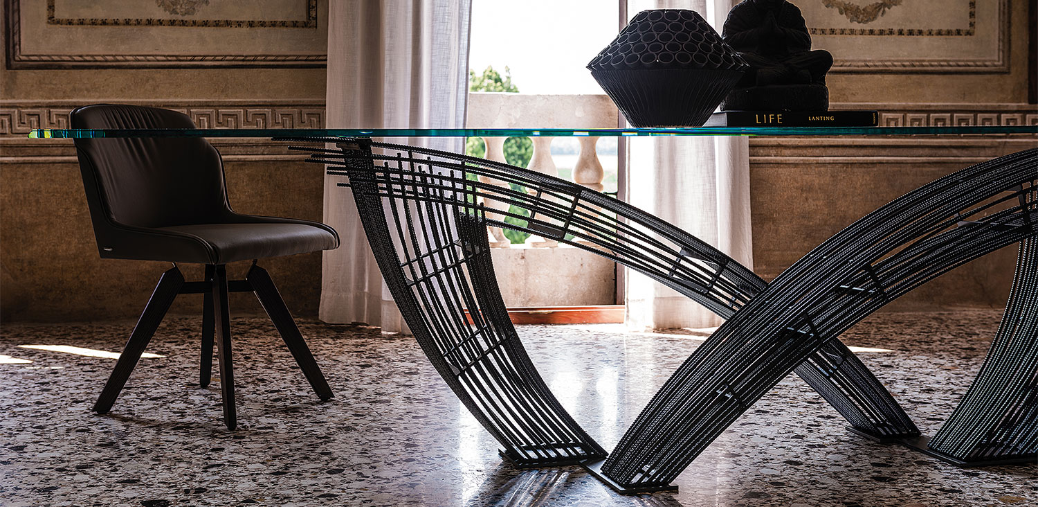 Table with transparent varnished steel base (OP0) and embossed graphite (GFM69) plates. Top in 15mm clear, extra clear or extra clear glass with reversed bevelled edges. The top is laid on the base. The finish of the base OP0 identifies a transparent coating on ferrous raw material. The presence of more or less obvious stains, colour variations, scratches and irregular edges is feature of the special material processing and should not be considered a defect.
