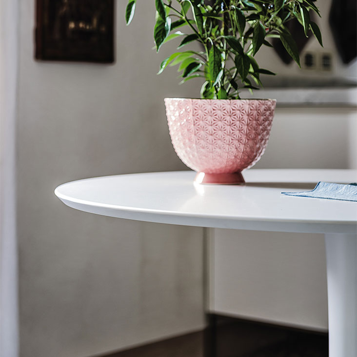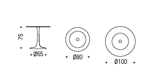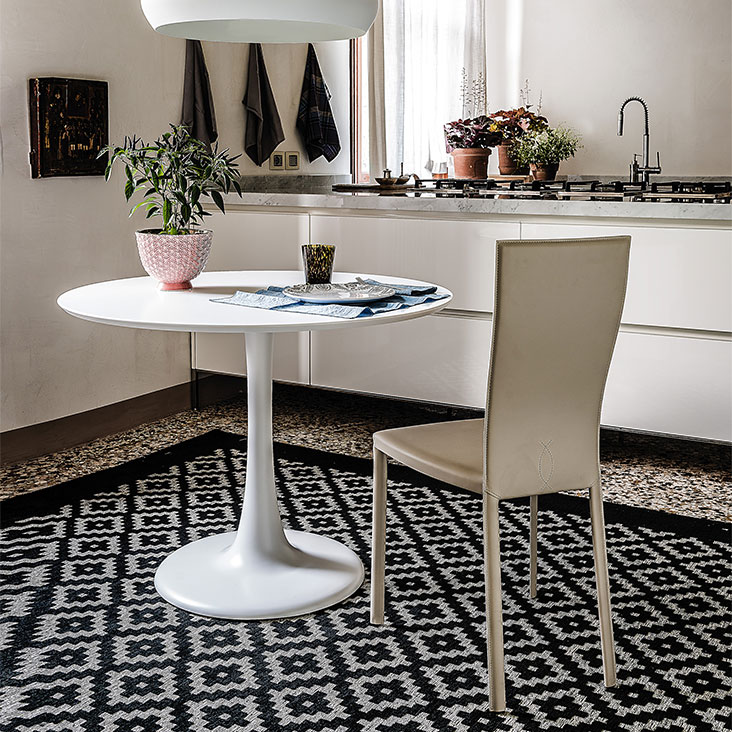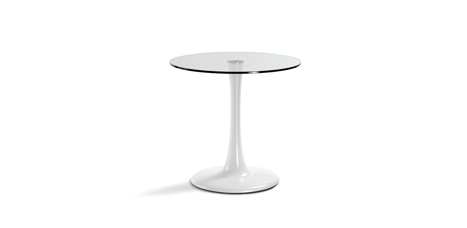 Bistrot table with white or black embossed rigid polyurethane base. Top in 12mm clear tempered glass, white (OP7) or black (OP17) lacquered MDF.