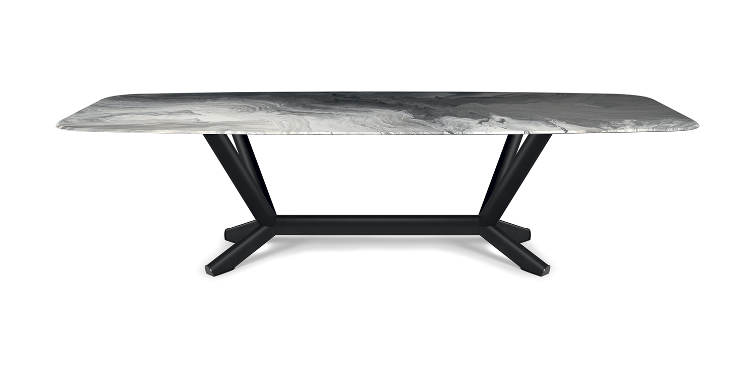 Table with base in titanium (GFM11), bronze (GFM18), graphite (GFM69) or black (GFM73) embossed lacquered steel, Brushed Bronze or Brushed Grey. Top 12mm thick in extra clear bevelled glass with artistic decorative printing in two different colours (CY01, CY02).