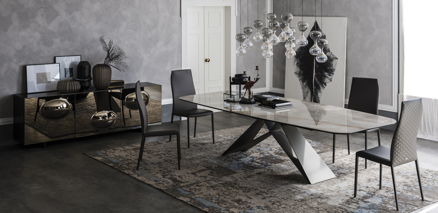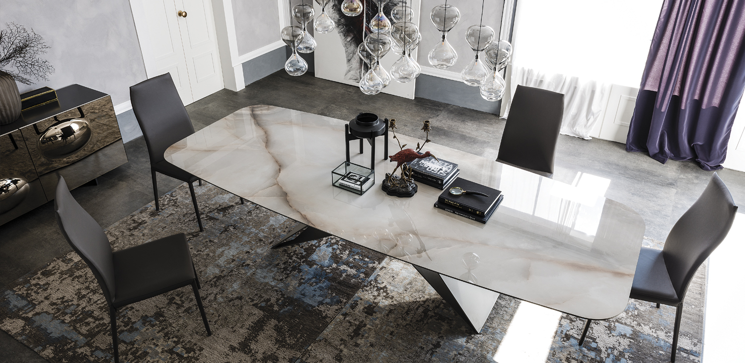 Table with base in titanium (GFM11), bronze (GFM18), graphite (GFM69) or black (GFM73) embossed lacquered steel. Marmi Calacatta (KM01), Alabastro (KM02), Ardesia (KM04), matt Golden Calacatta (KM05), glossy Golden Calacatta (KM06), matt Portoro (KM07), glossy Portoro (KM08), glossy Sahara Noir (KM09), Emperador (KM10), Makalu (KM11), Breccia (KM12) or Arenal (KM13) ceramic top.