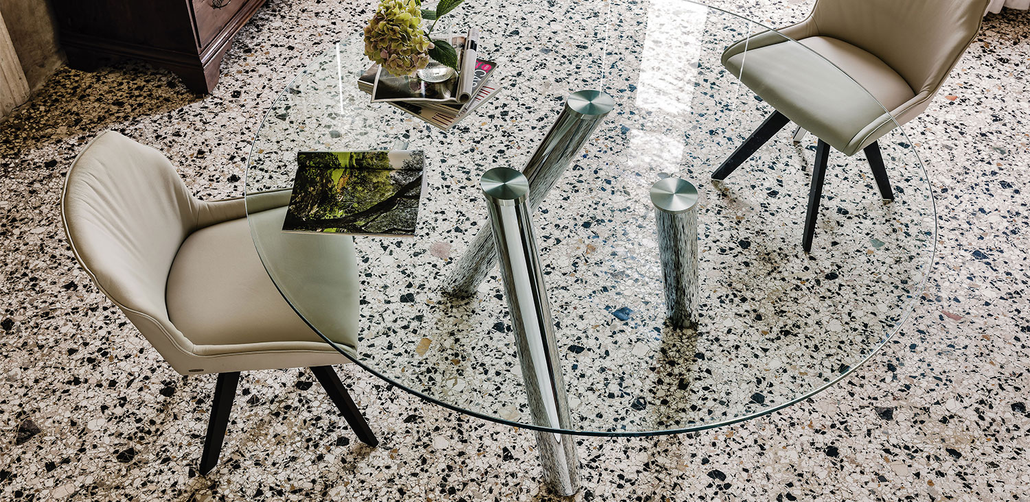 Table with base in chromed steel (08), black chrome (06), painted matt white (OP71), matt graphite (OP69) or covered in leather as per sample card. Top in 15mm tempered clear glass.
