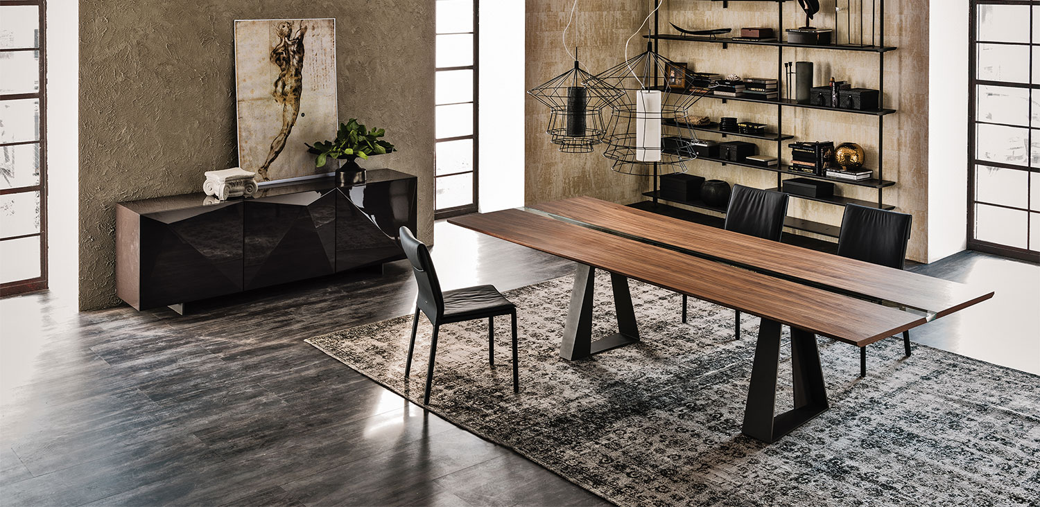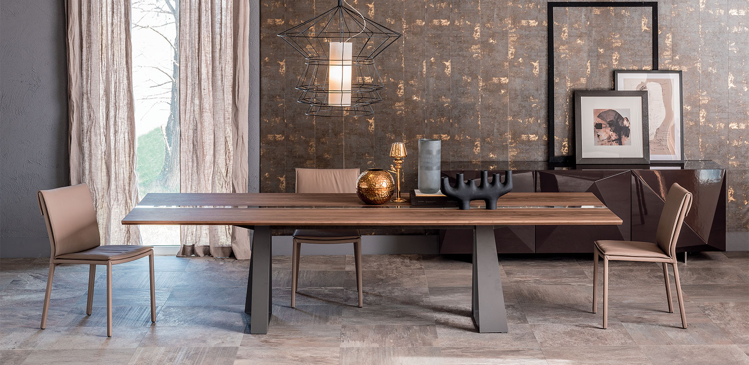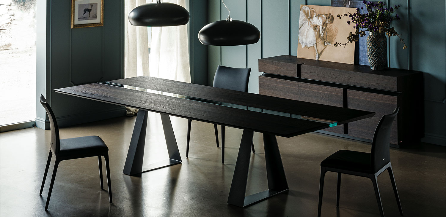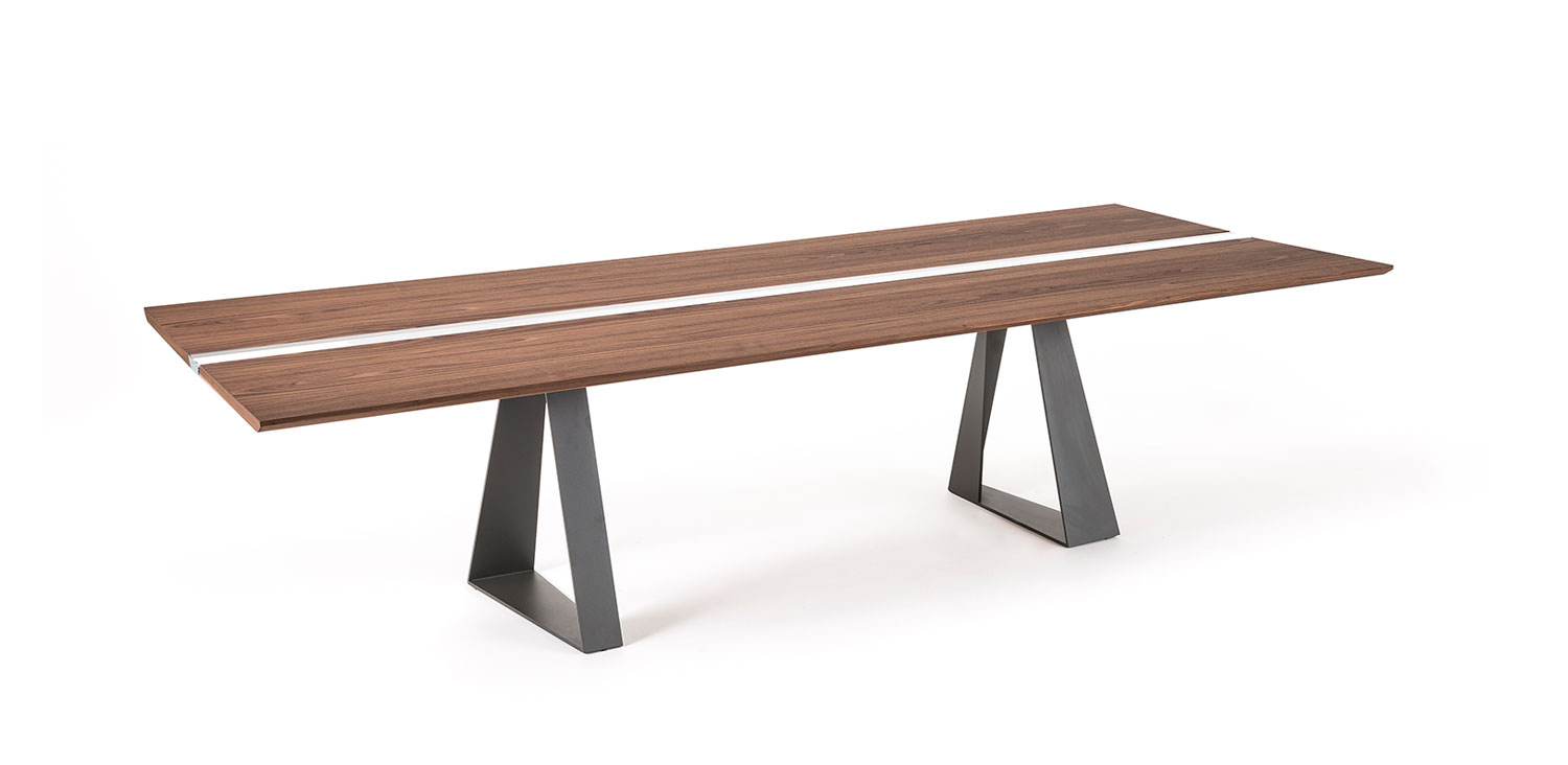 Table with base in graphite (GFM69), white (GFM71) or black (GFM73) embossed lacquered steel. Top in Canaletto walnut (NC) or burned oak (RB) with central insert in extra clear laminated glass.