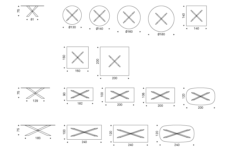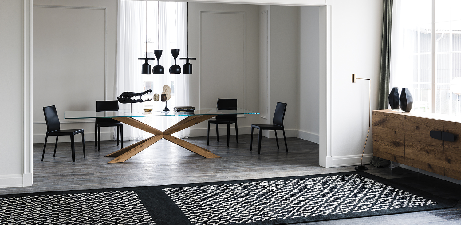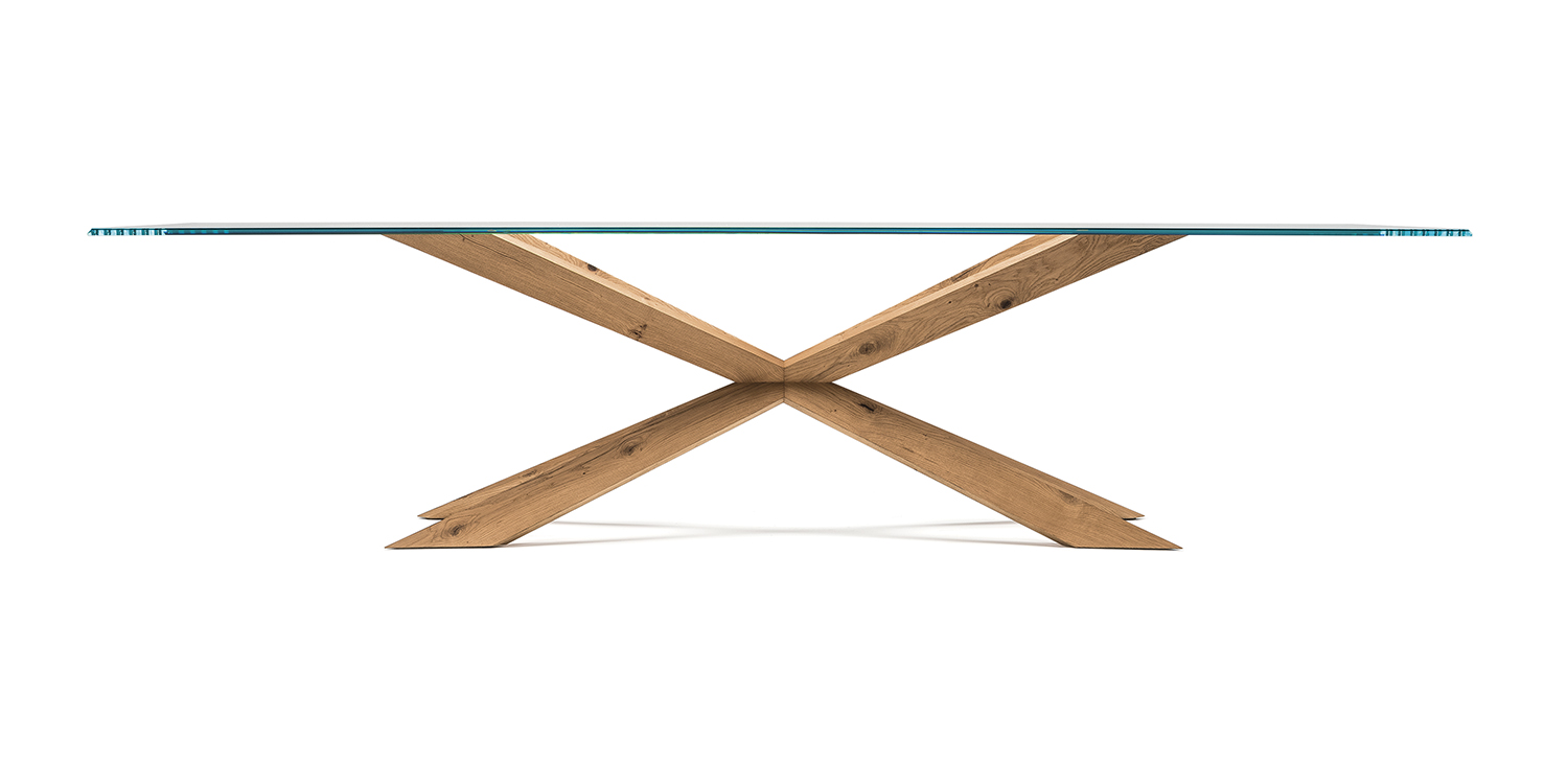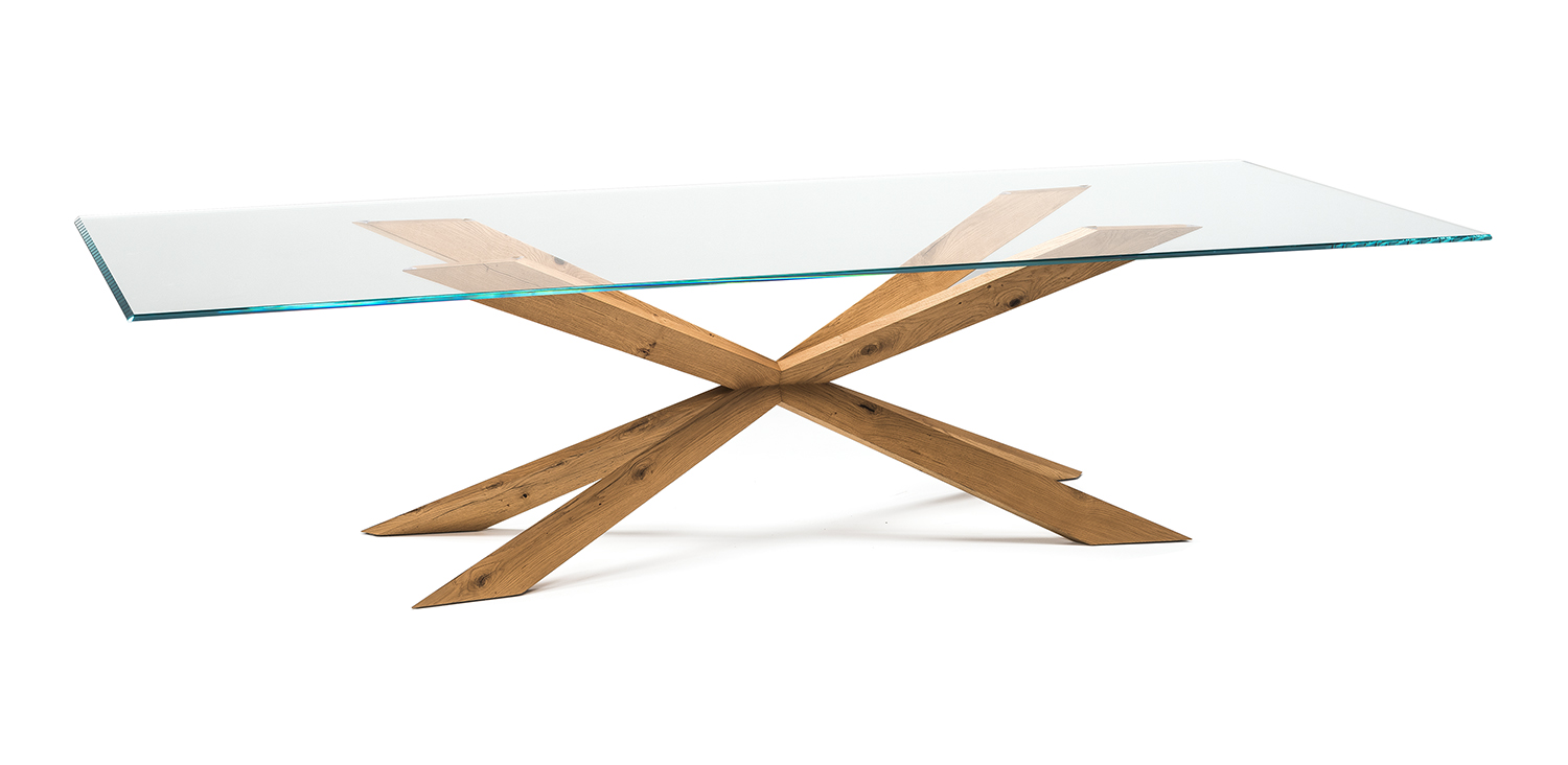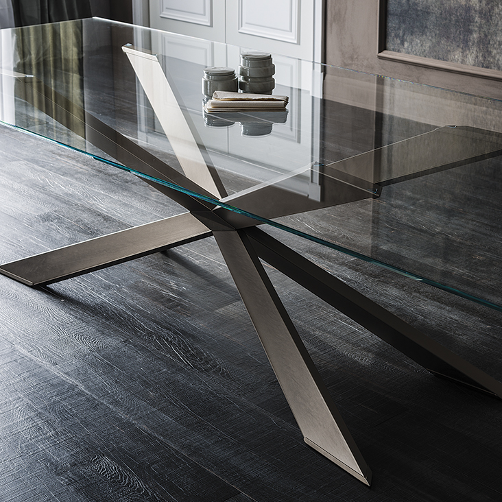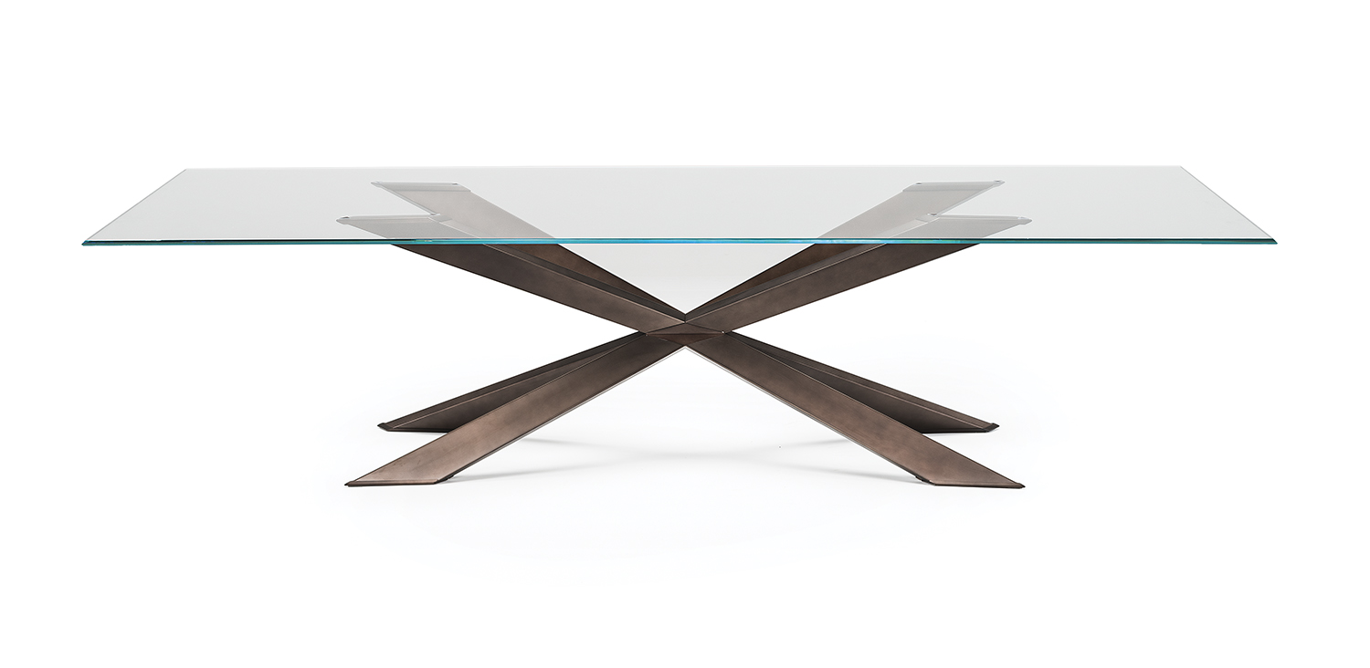 Table with base in matt black (OP17), graphite (OP69), white (OP71) painted steel, or in weathered brass or polished stainless steel, or in satin bronze (15), satin titanium (11) painted steel, or with wooden base in Canaletto walnut (NC), dark Wenghè (W2) or Heritage oak (HR). Top in 15mm clear, extra clear or extra clear glass with reversed bevelled edges, laid on the base. Glass top 12mm on 200x106 and 182x90 version. Small reflection irregularities on the stainless steel base or glazes on the satin titanium or satin bronze painted base are due to handmade processing.