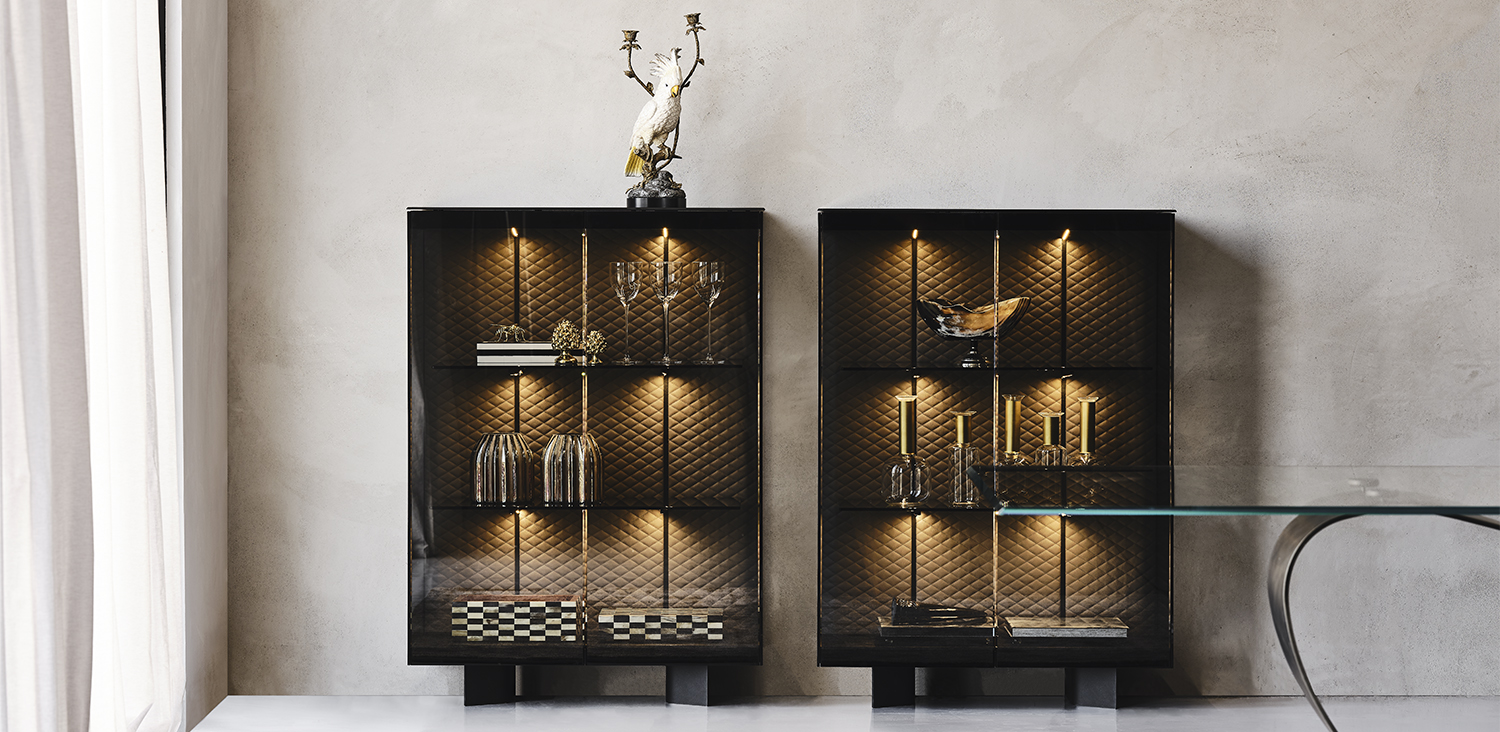 Sideboard with frame and feet in black embossed lacquered steel (GFM73), doors and sides in fumé glass with stripes in black painted glass. Top and bottom in black painted frosted glass, internal back covered and quilted in soft leather or synthetic leather as per sample card. Internal shelves in fumé glass. LED light.