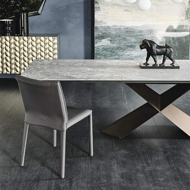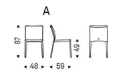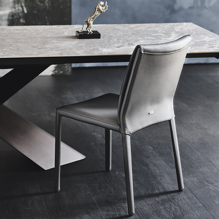 Chair with or without arms with steel frame completely covered in fabric, synthetic nubuck, micro nubuck, synthetic leather or soft leather as per sample card. The cover is not removable.