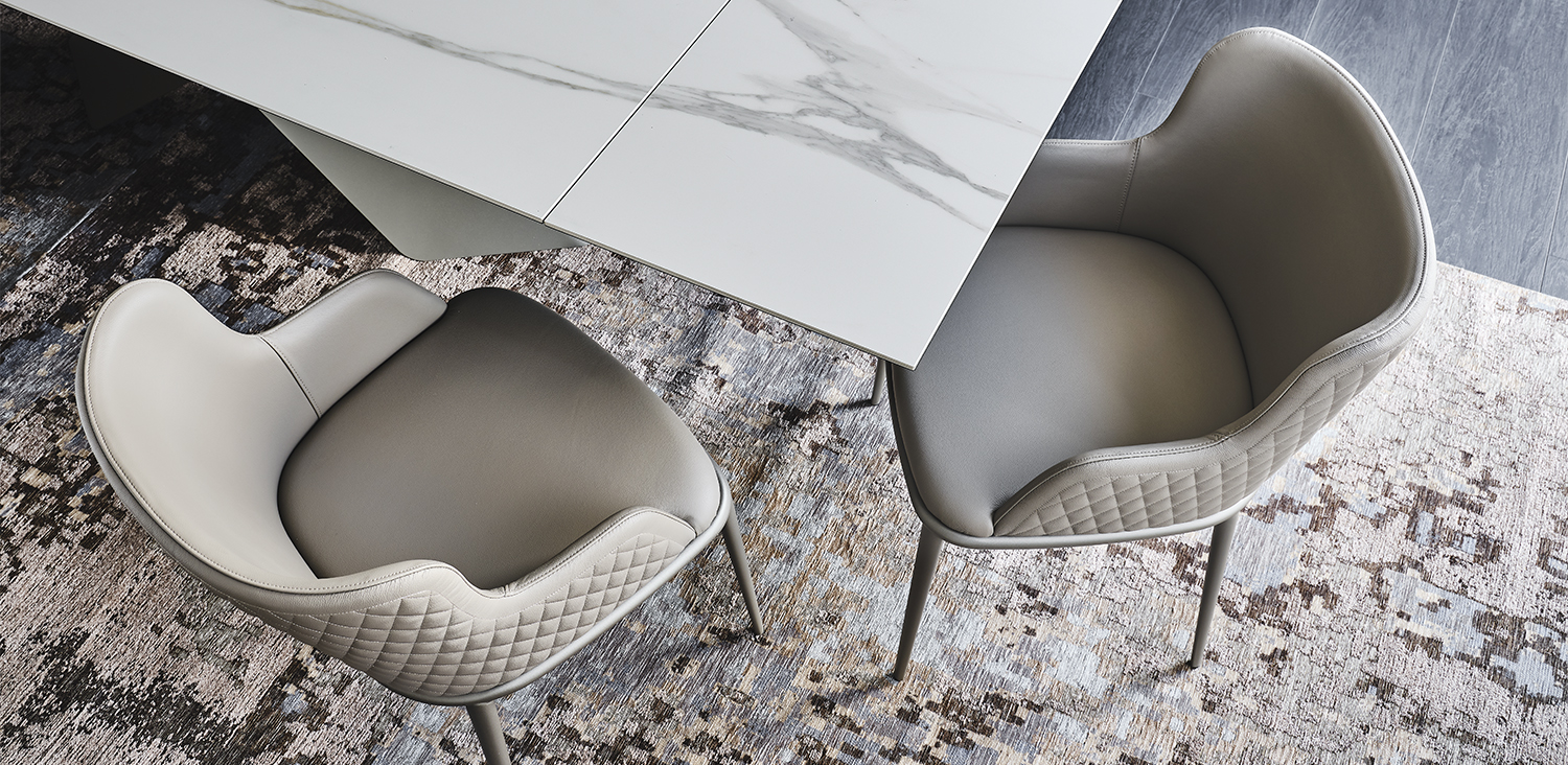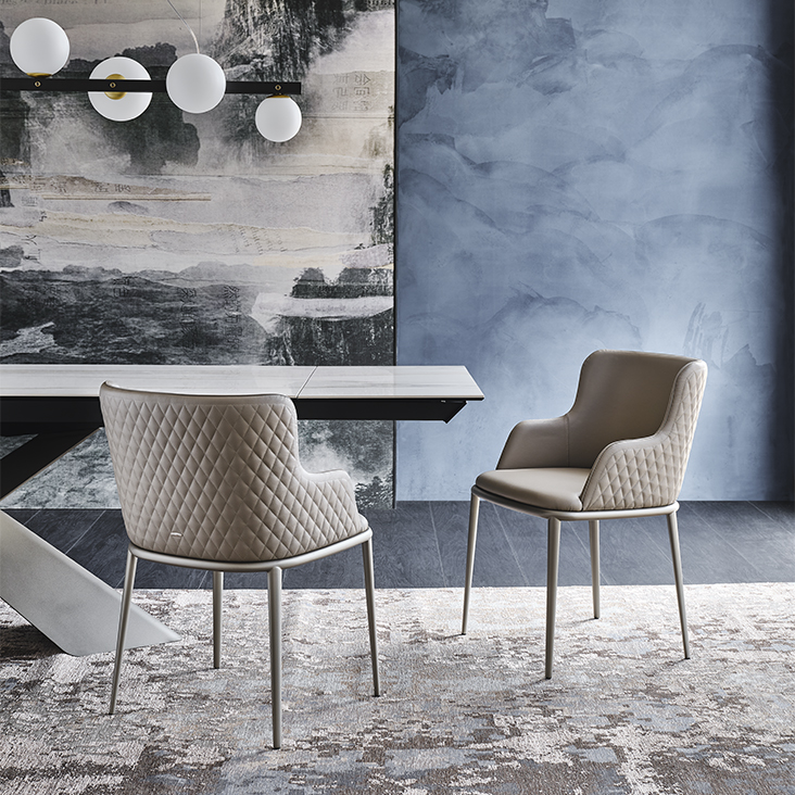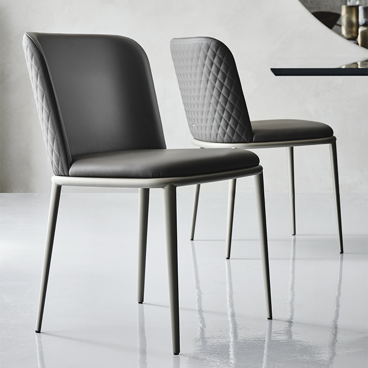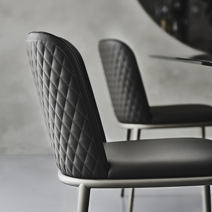 Chair with or without arms with frame in titanium (GFM11), bronze (GFM18), graphite (GFM69), white (GFM71) or black (GFM73) embossed lacquered steel. Cover in synthetic nubuck, soft leather or synthetic leather as per sample card. Quilted seatback cover. The cover is not removable.