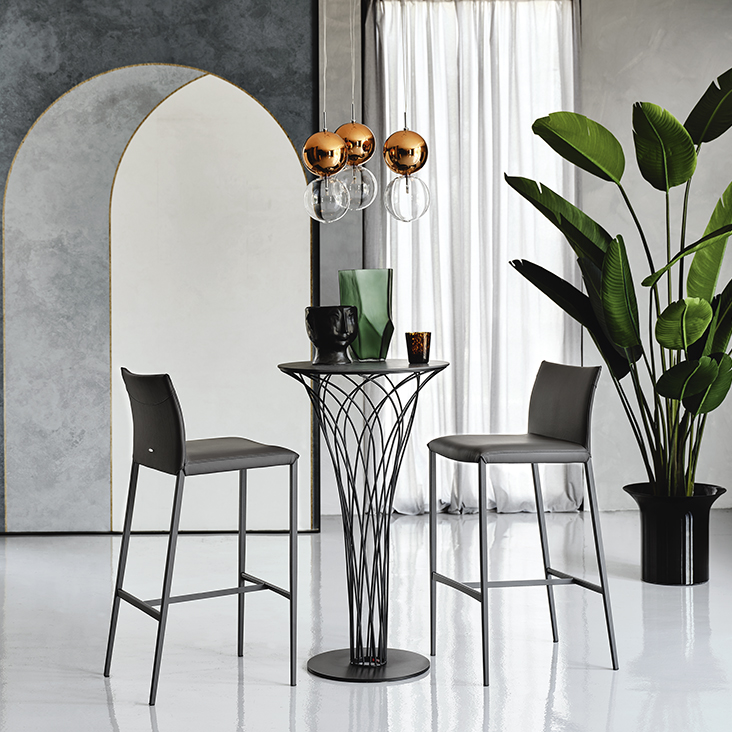 Stool with frame in titanium (GFM11), bronze (GFM18), graphite (GFM69), white (GFM71) or black (GFM73) embossed lacquered steel. Cover in fabric, synthetic nubuck, micro nubuck, soft leather or synthetic leather as per sample card. The cover is not removable.
