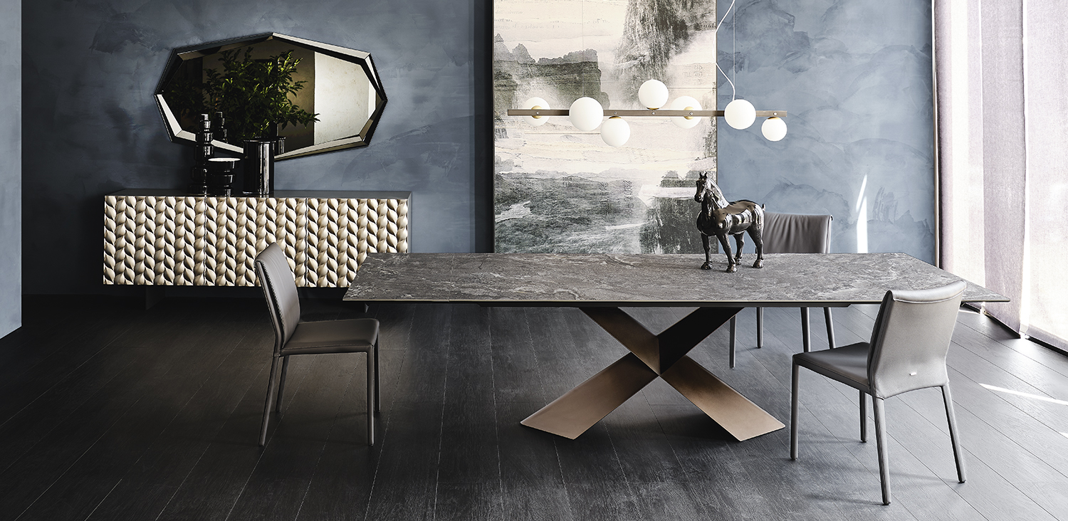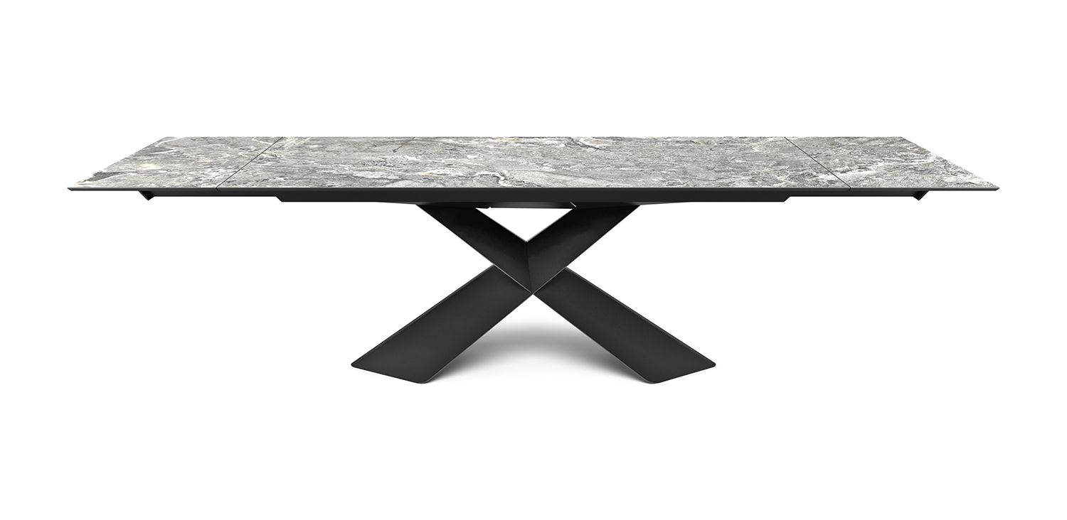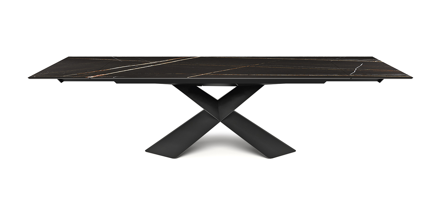 Extendible table with base in titanium (GFM11), bronze (GFM18), graphite (GFM69) or black (GFM73) embossed lacquered steel, Brushed Bronze or Brushed Grey. Marmi ceramic in Alabastro (KM02), Supreme (KM03), Ardesia (KM04), matt Golden Calacatta (KM05), glossy Golden Calacatta (KM06), matt Portoro (KM07), glossy Portoro (KM08), glossy Sahara Noir (KM09), Emperador (KM10), Makalu (KM11), Breccia (KM12) or Arenal (KM13) ceramic top.