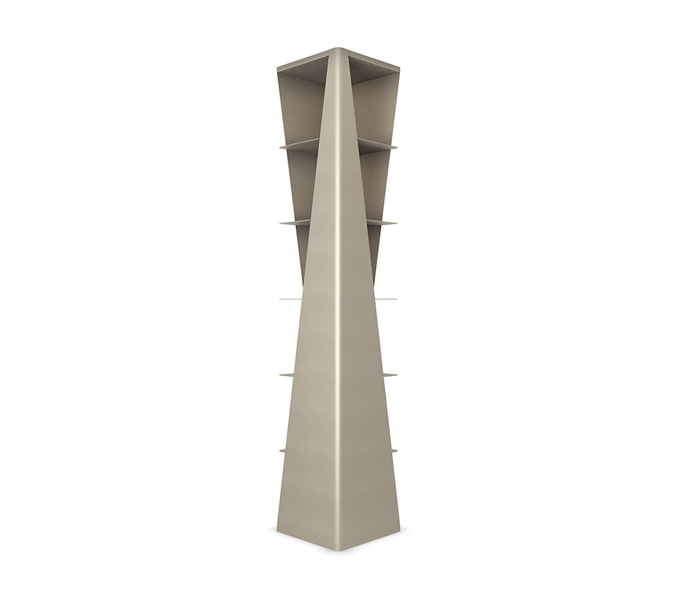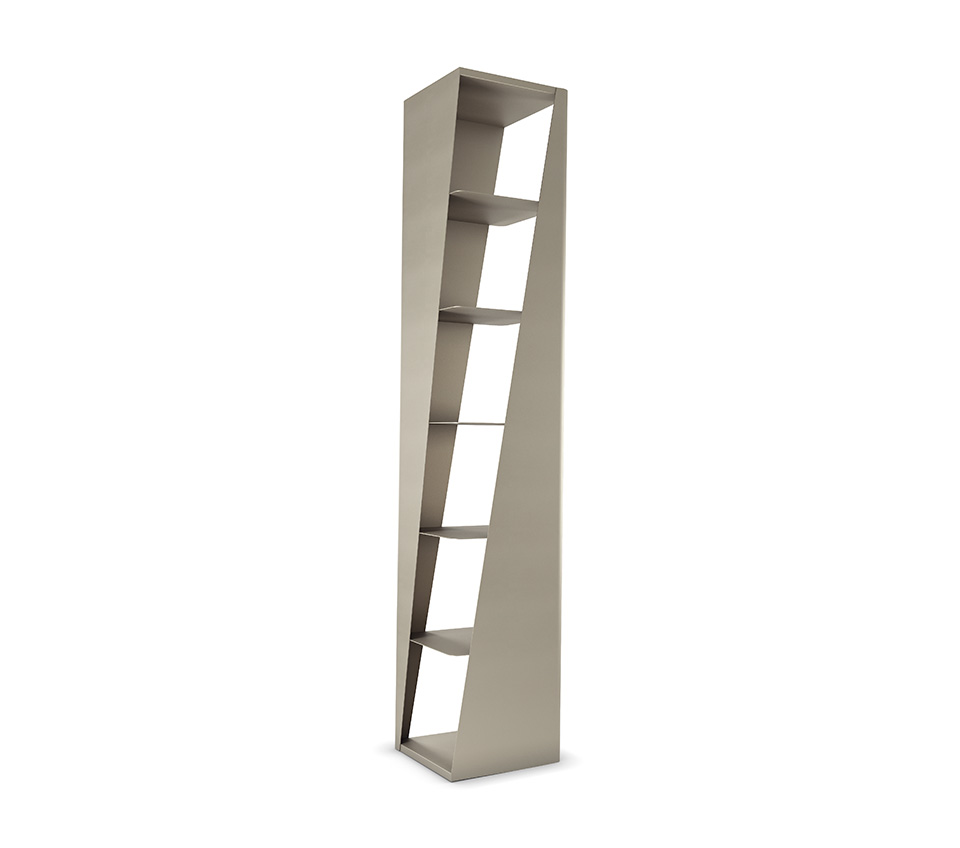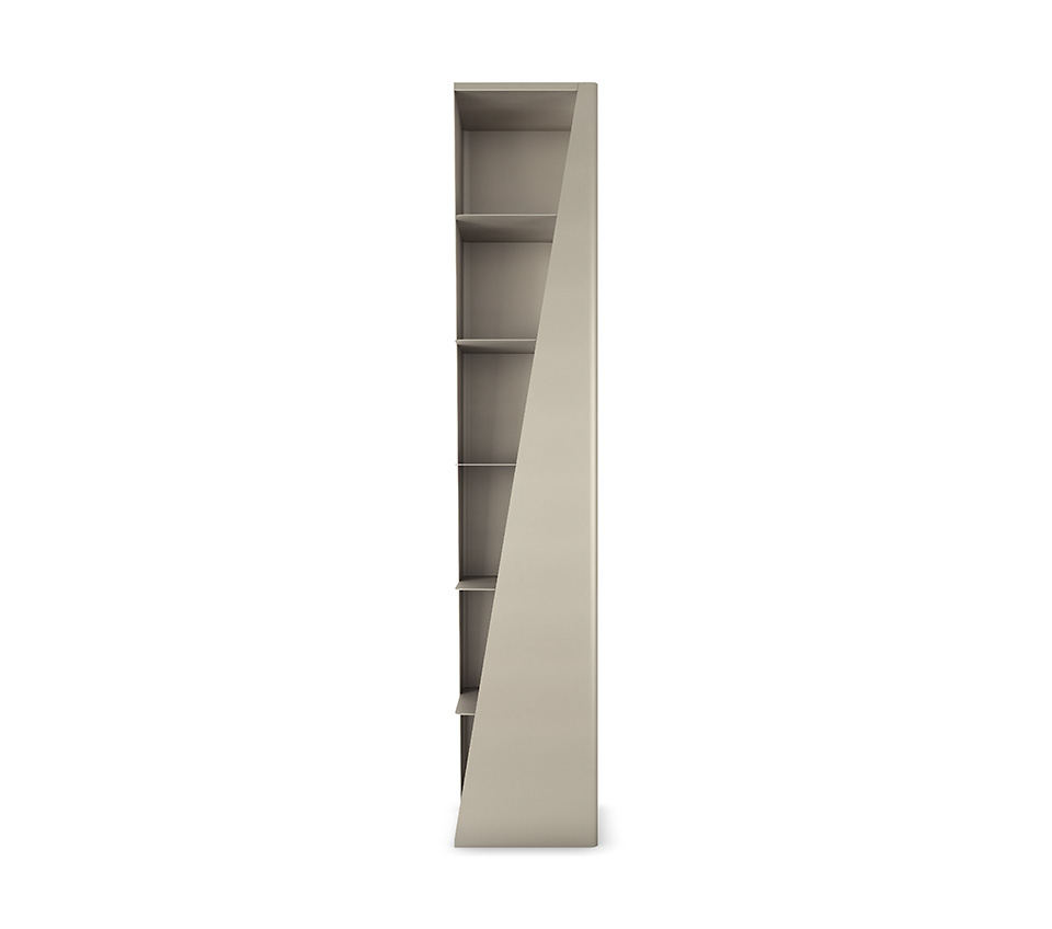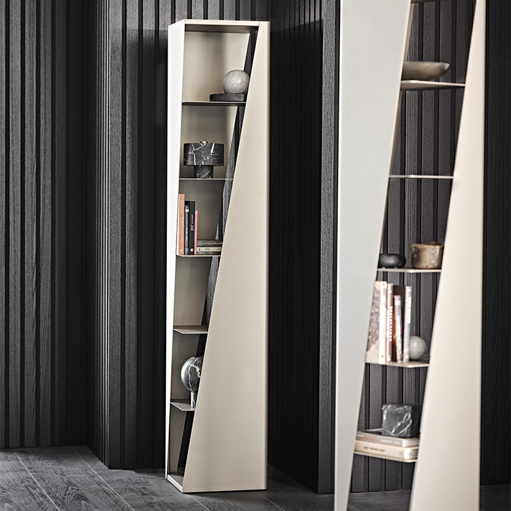 Its compact size makes it suitable for a narrow wall, a reading corner or an elegant hallway. However, this design bookcase is highly capacious with seven useful shelves. Furthermore, several modules can be placed side by side, maintaining their direction or rotating them, to create an intriguing geometric composition marked by diagonal cuts and with the shelves visible or hidden to varying degrees.