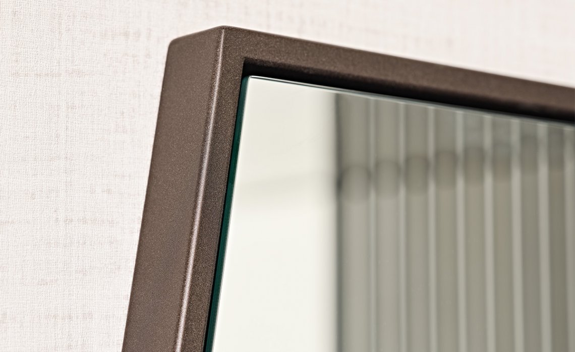 The Sautern modern mirror has an iconographic silhouette defined to appear as a logo or crest in the centre of a wall with a pop style. The gentle lower curve is framed by an angular steel geometry, with the distance between the two elements emphasising the contrast between materials and shapes. The rear wall that can be glimpsed in the empty space thus created becomes an integral part of this design mirror. The mirrored surface resembles a drop suspended in mid-air, joined to the frame only on the upper side.