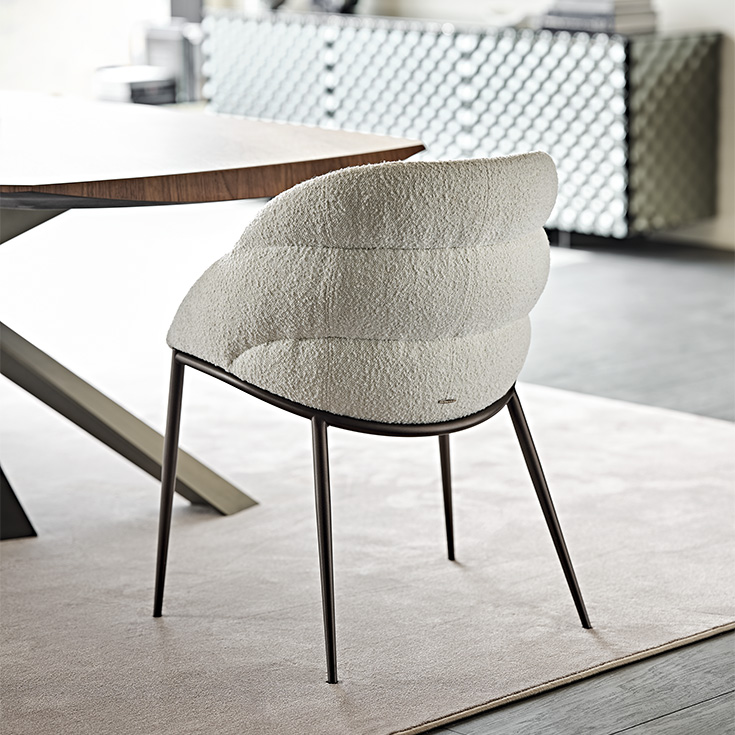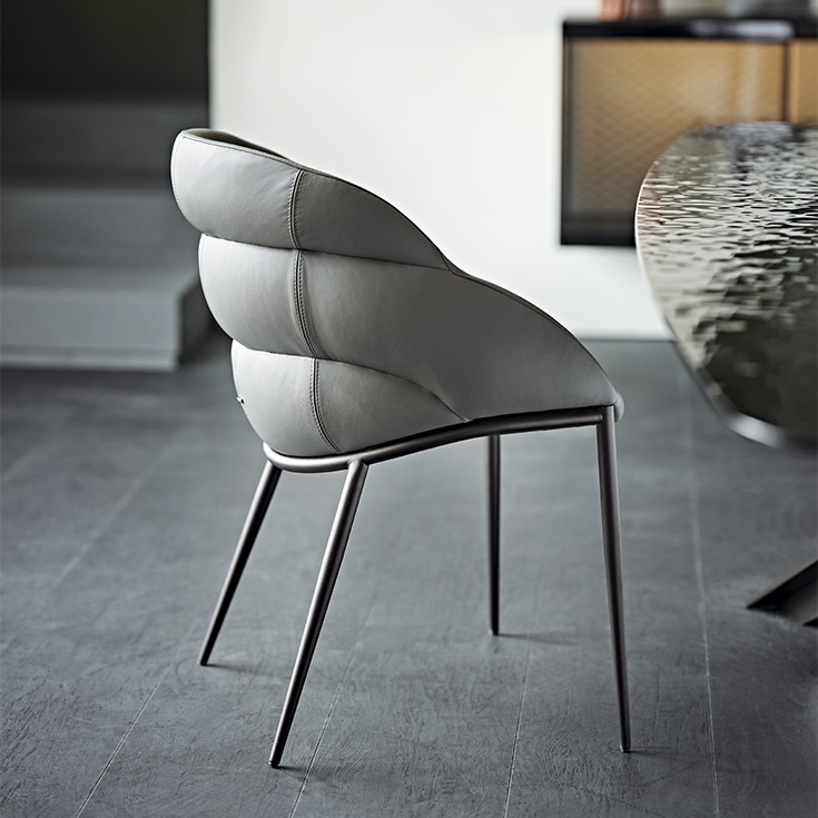 The Camilla armchair is the perfect example of a chair with padded armrests that completes a room with the delicacy and sensuality you want in a residential setting. The horizontal seams on the back of the backrest produce three padded protrusions that end uniformly and very fluidly in the armrest. In the lower part of the backrest, the deep structure and the connection of the legs emphasise the softness of the enveloping curves.