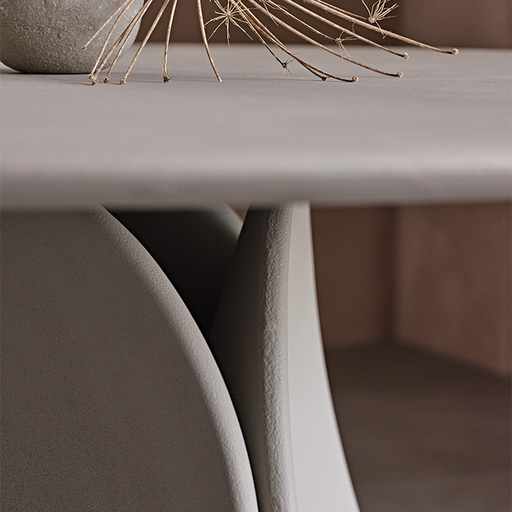 The design of the Maxim table-sculpture stems from the seamless link between its shape, consisting of three petals, and the material it is made from. It derives from manual craftsmanship and a cold moulding technique, which does not involve exploiting energy resources. The industrialised processes are only to support the high artisan component of the manual phases of pouring the liquid cement and the finishing. The base of this modern table is in fact finished in clay, with earthy and natural shades.