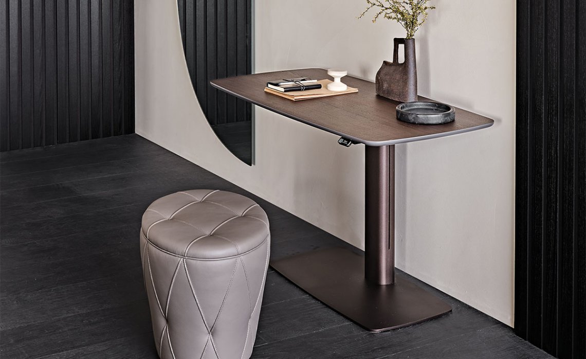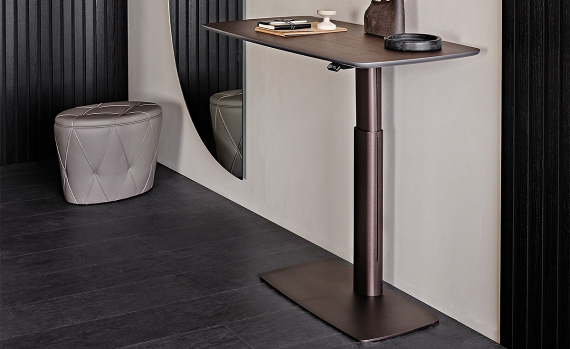 The height of this adjustable desk can easily be changed thanks to an ingenious electronic lever, promoting correct posture for your sitting position and allowing standing use. While the ergonomic aspect is central, there’s no ignoring the refined details and finishes that enhance this design desk made with high-quality materials. The Runner family is available with a ceramic, wood or leather top, giving life to the Runner Keramik, Runner Wood and Runner Leather models.