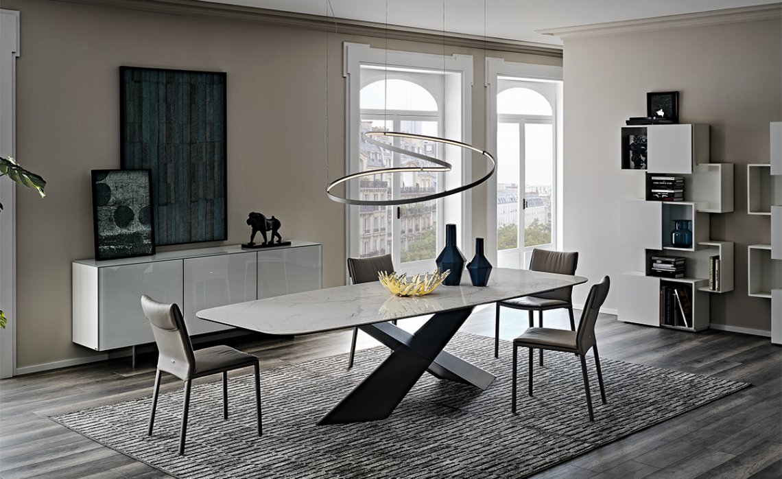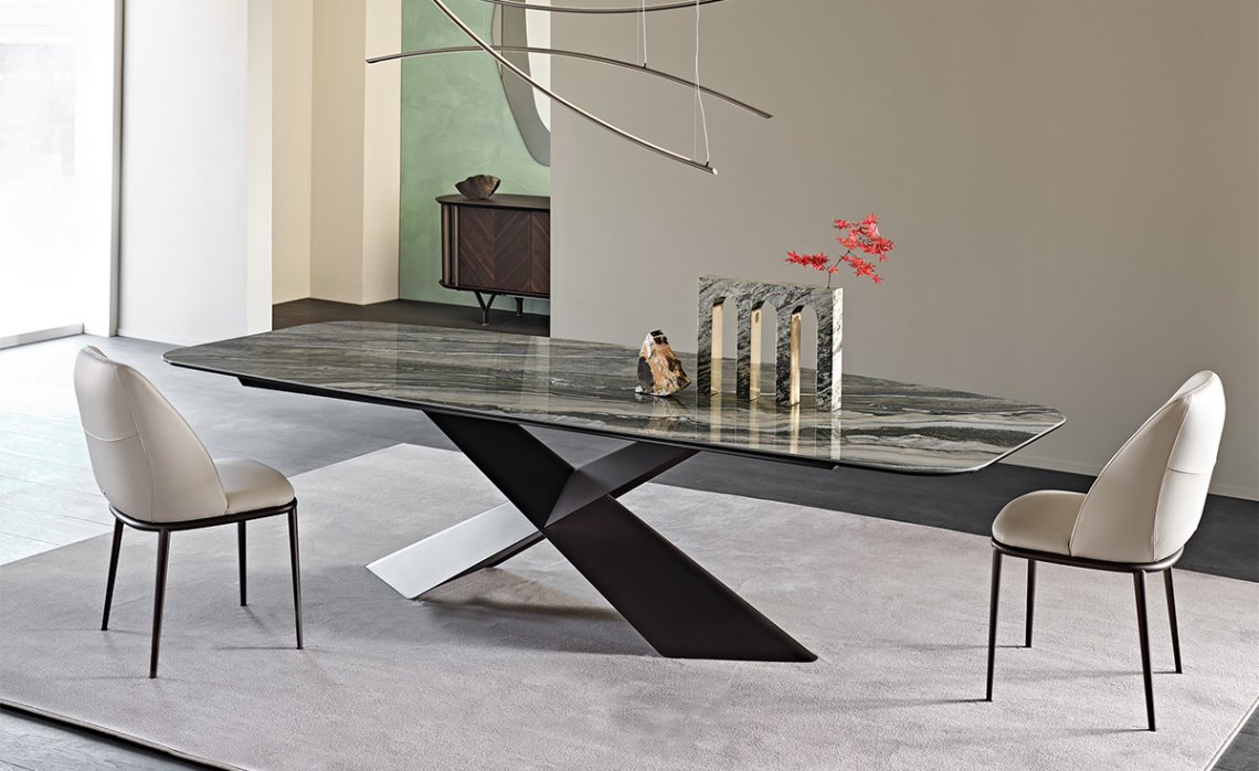 For those devoted to conviviality, even in limited spaces, there are two extendable Drive versions available: one for the refined glass top, with decorative CrystalArt print in different colours, and the other for the Marmi Ceramic top, in several exclusive shades, to make each environment remarkable. The collection is completed by the Signature model, hand-decorated by an artisan collective. Each table is unique and irreplicable, just like a work of art.