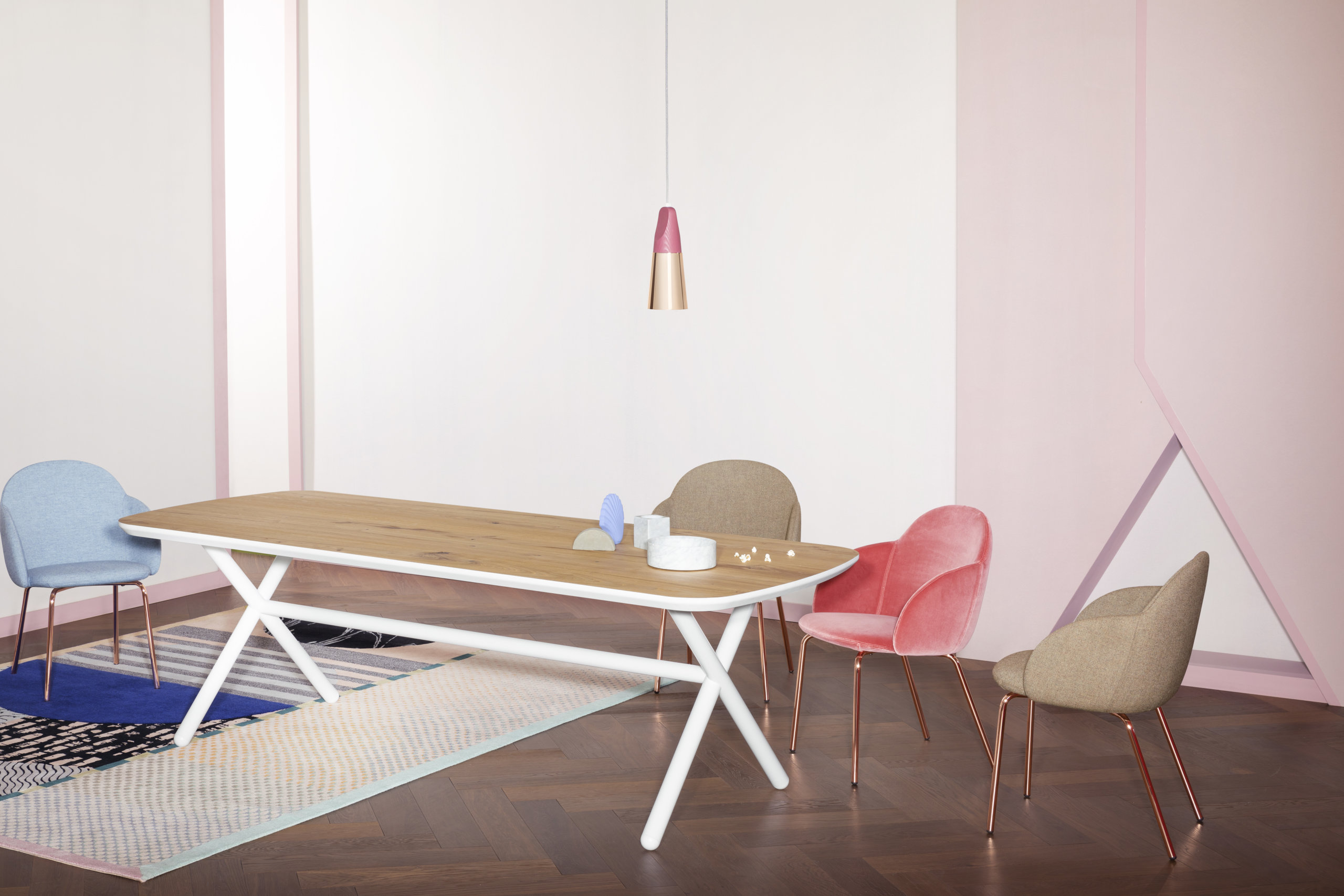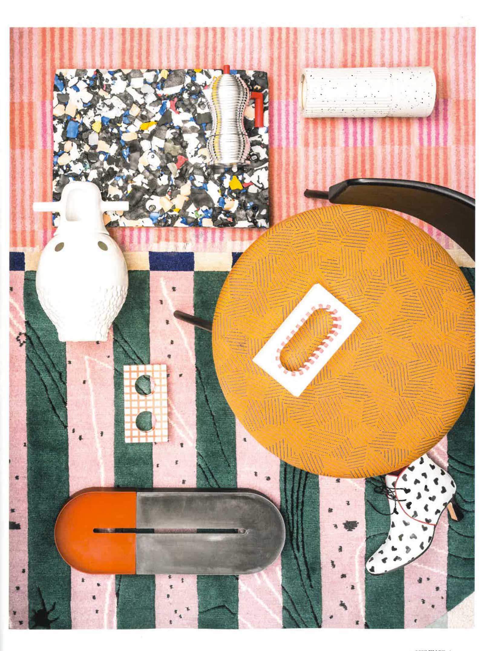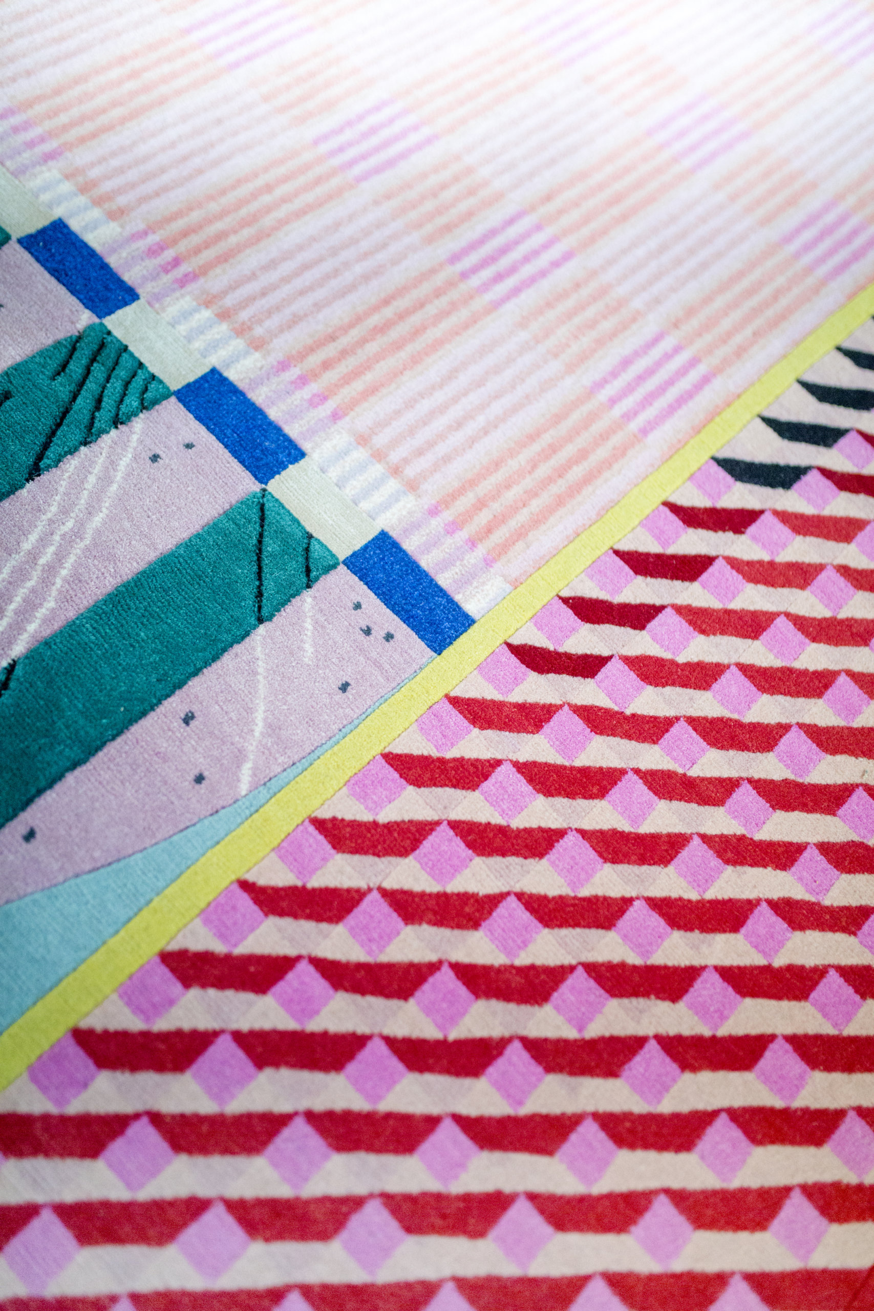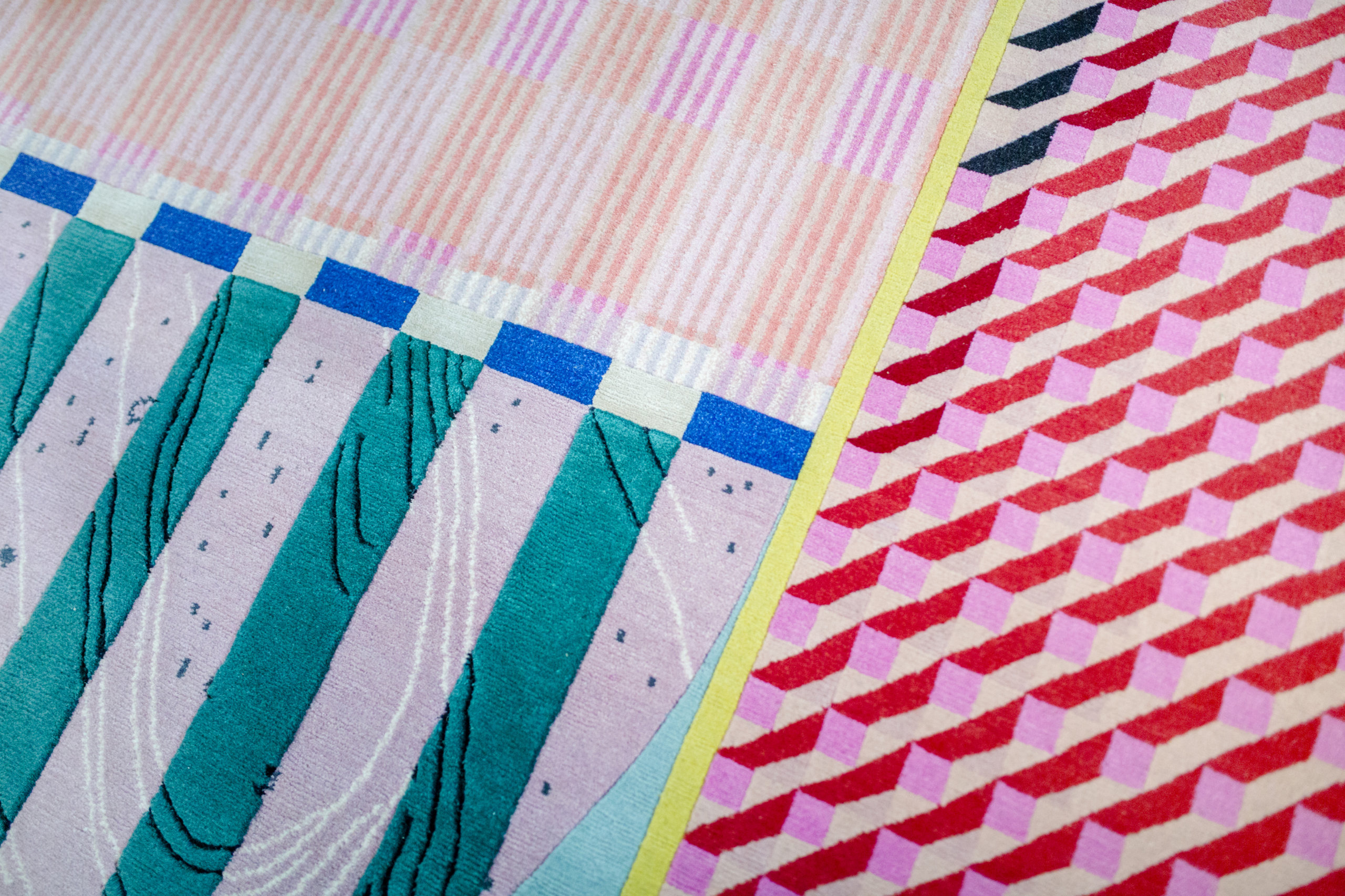 ONE OR THE OTHER is a collection inspired by various materials of the physical world that have opposing characteristics of fiber or textile with which they are paired. This collection is an abstract representation of the concept of unique worlds colliding and coexisting on one surface. Additionally, it is a celebration of color and pattern—a positive stimulation of the senses.