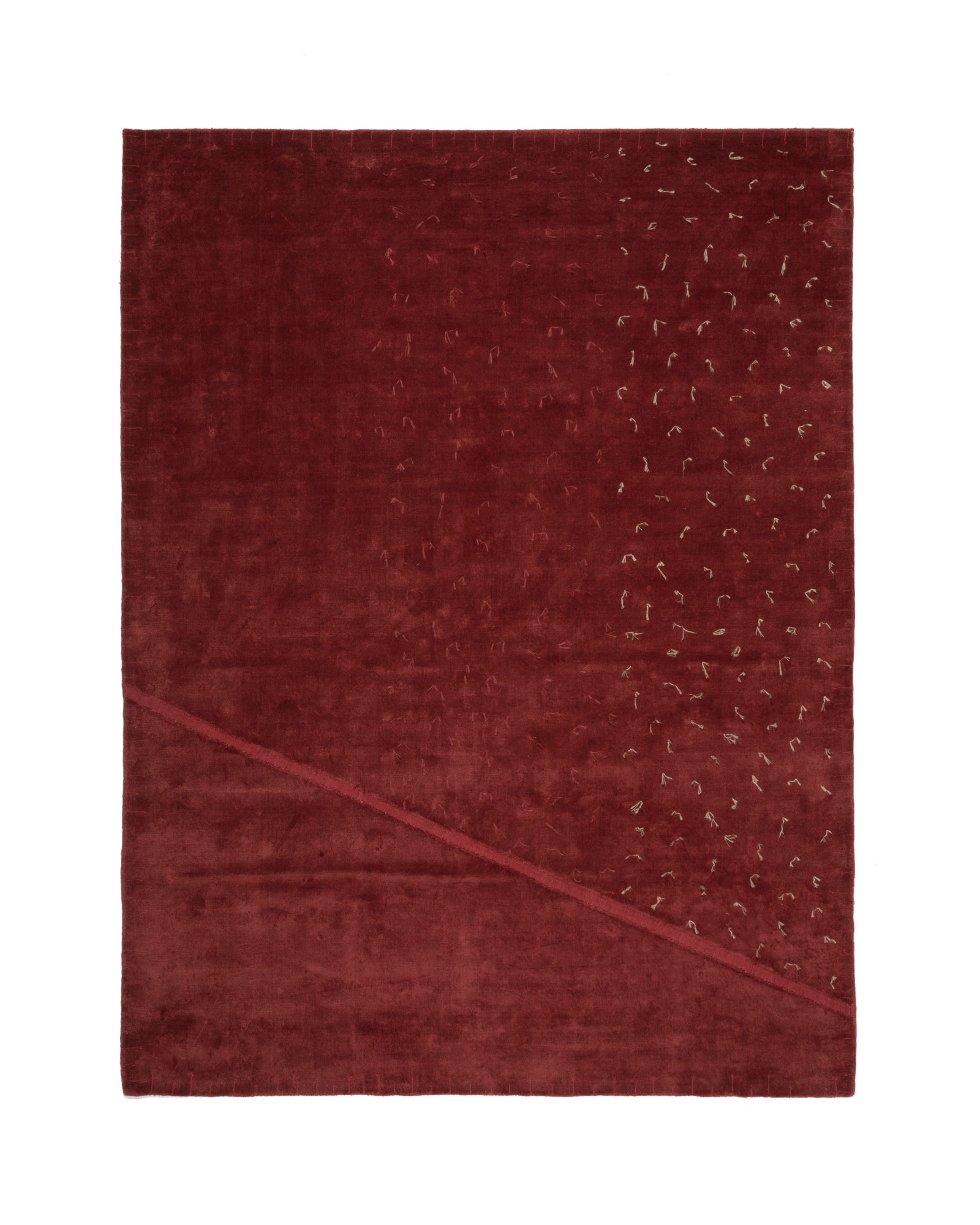 British designer Faye Toogood has delved into her material library to create her new collection of rugs, produced in collaboration with the Italian manufacturer CC-Tapis. The wide range of materials, patterns and haberdashery in the Toogood archives provided the initial inspiration behind these 10 new designs, which translate postindustrial influences such as vulcanized rubber, distressed plaster and security mesh into raw yet gentle furnishings. The resultant rugs experiment with a variety of quilting, applique and stitching techniques: “Cage” features a diamond latticework effect derived from steel grilles; “Rope” and “Quilt” incorporate sinuous appliqued coils; “Thread” and “Patch” play with layering and fraying; and the diagonally bisected “Tack” features a graphic, abstracted stitching detail.