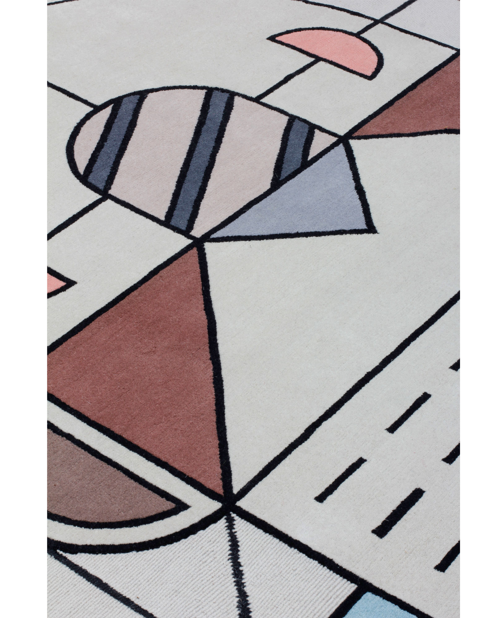 In the Flatlandia Collection by Elena Salmistraro rugs are transformed into two-dimensional universes inhabited by geometric shapes, just like in the novel Flatland, the fantastic story in multiple dimensions, written by Reverend Edwin A. Abbott in 1884. Triangles, lines, circles and squares overlap, meet and collide becoming conscious of each other, just as they do in the novel, unaware of the colors and the magic they hold. The collection has two faces; one more tactile and “rough”, the other softer and lighter, one more intense and crowded, the other sober and sublime. A series of rugs which play with contrast emphasizing duality and the craftsmanship involved in their creation. It is no coincidence that the rugs have the names of famous mathematicians: Cartesio, Pitagora and Eulero.
