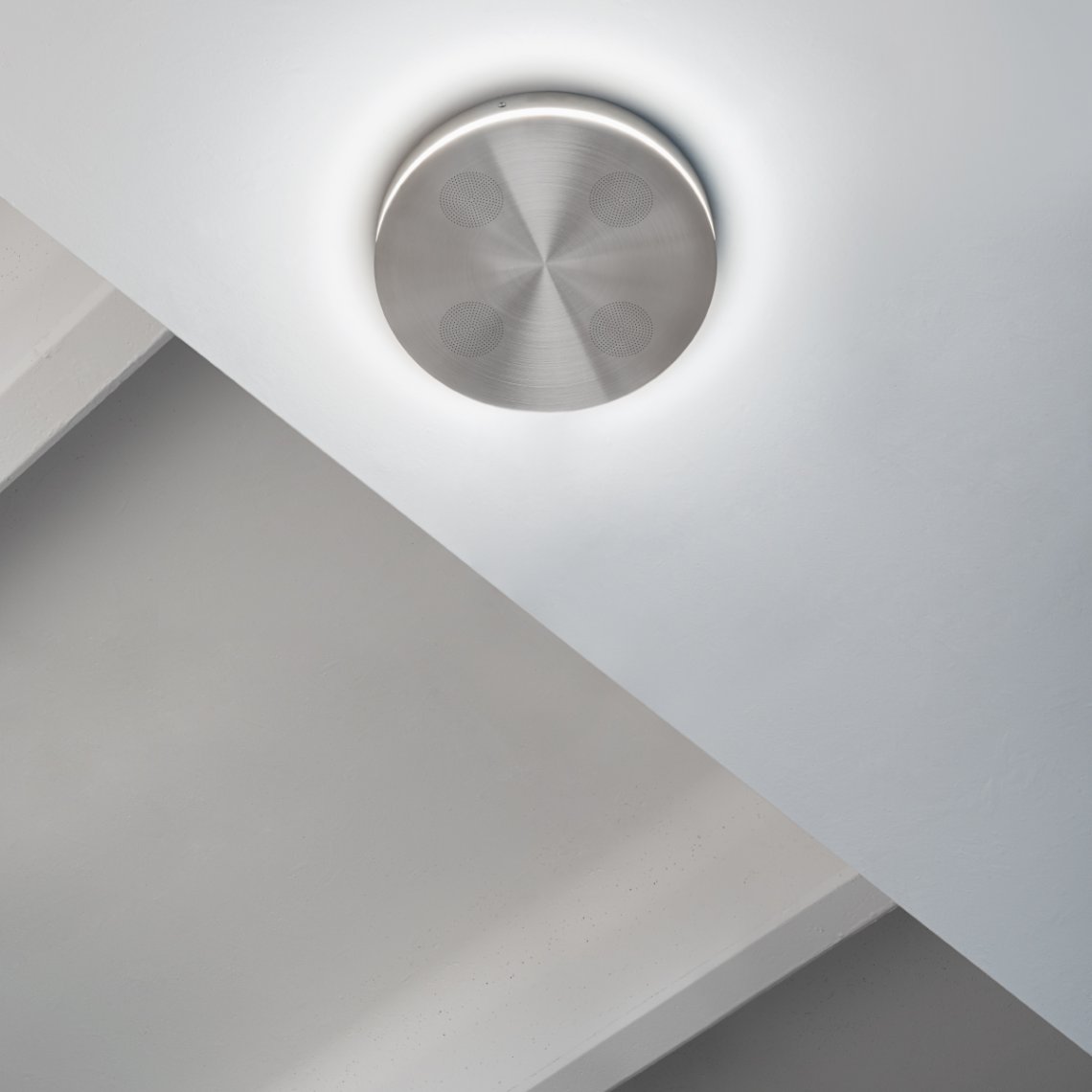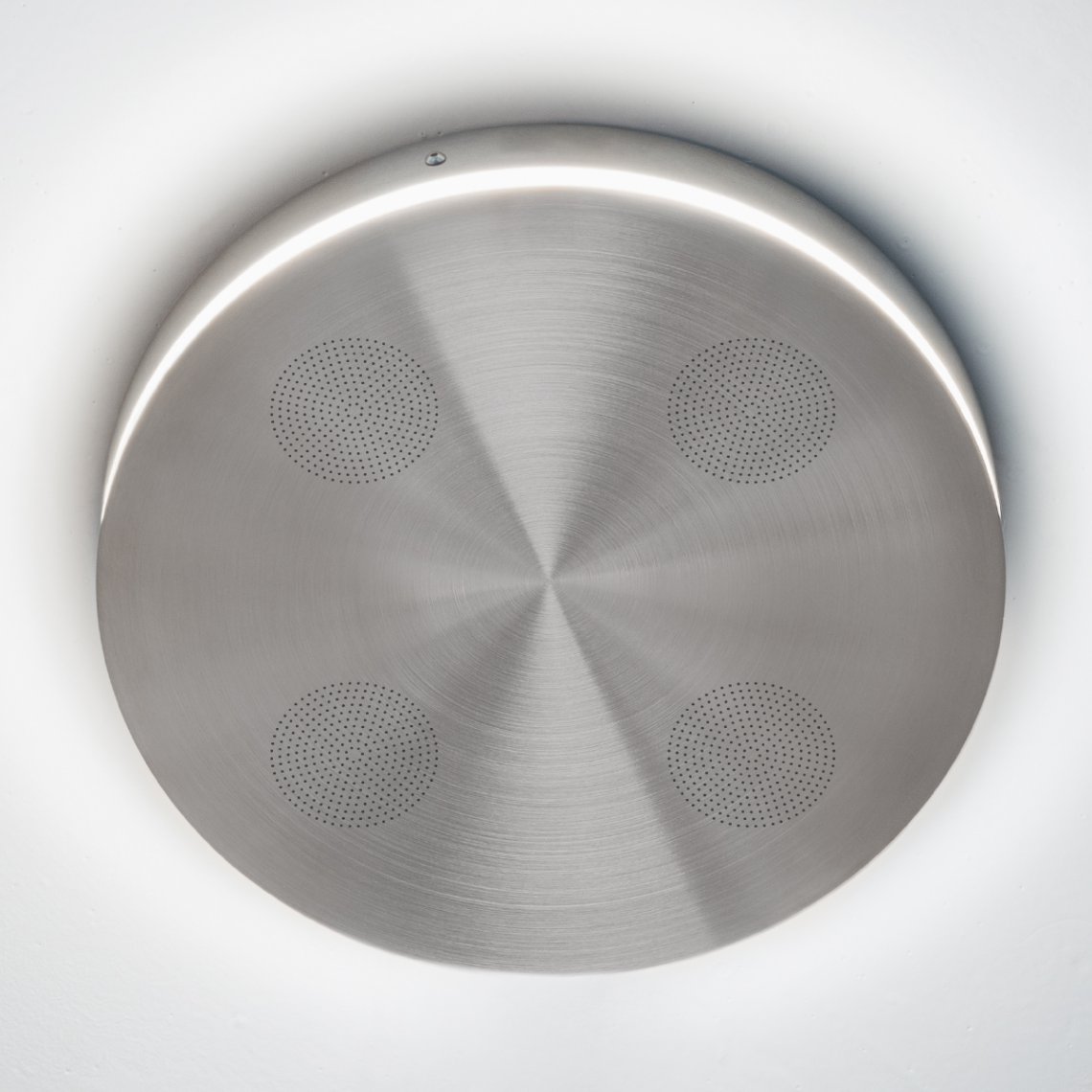 Ceiling LED lighting in AISI 316L stainless steel, with loudspeakers for Bluetooth connection and ionization/ozonation system technology. Remote control included