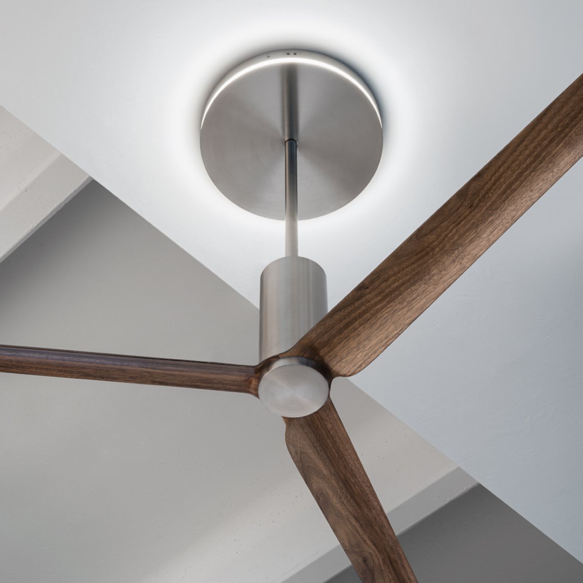 Ceiling fan (? 2100 mm) in AISI 316L stainless steel, with wood and carbon fiber blades, natural wood essence or lacquered. Integrated LED lighting, remote control included. Product suitable for indoor installation