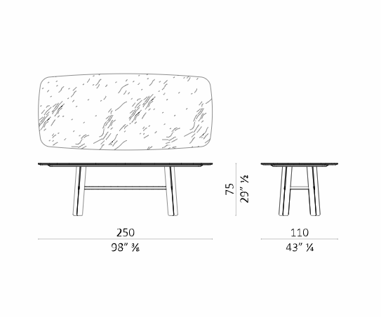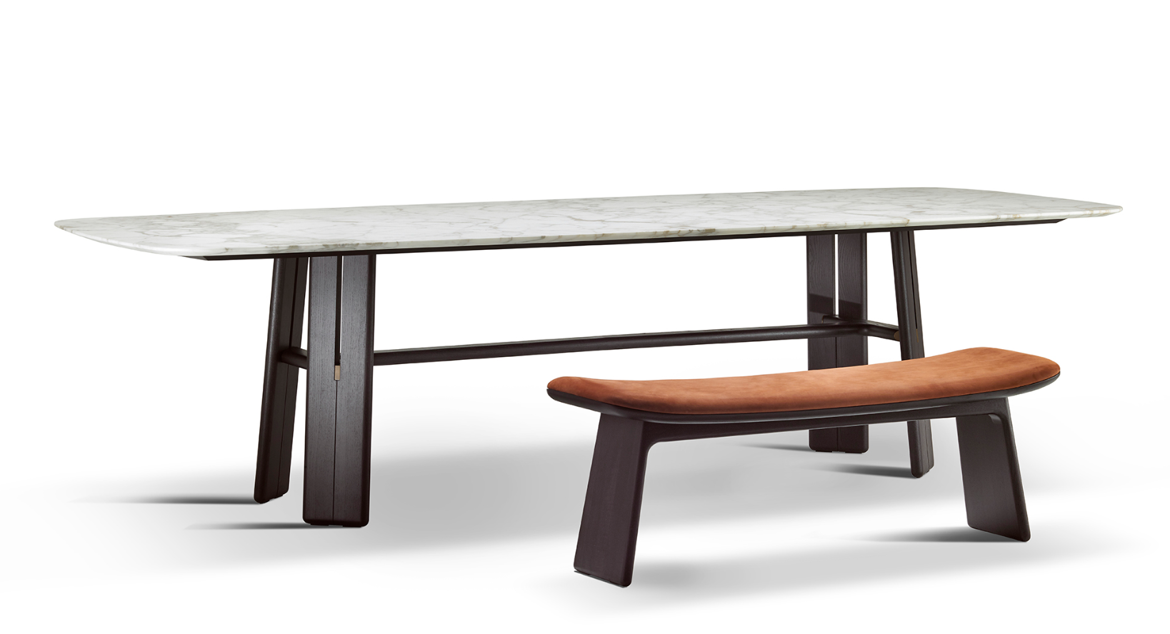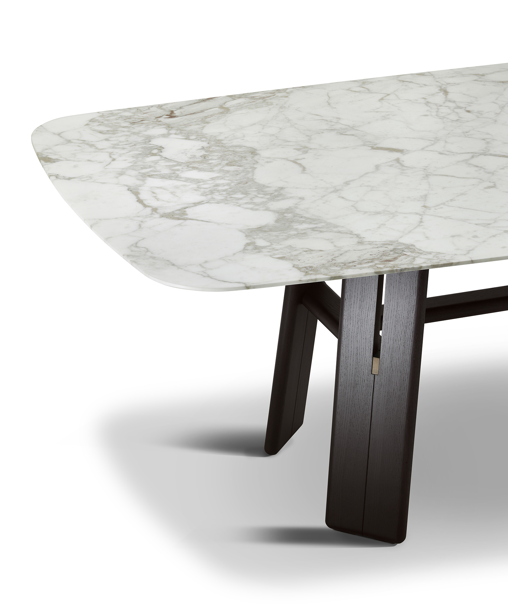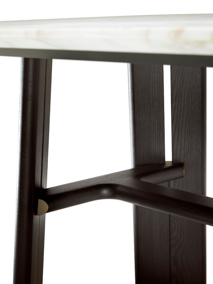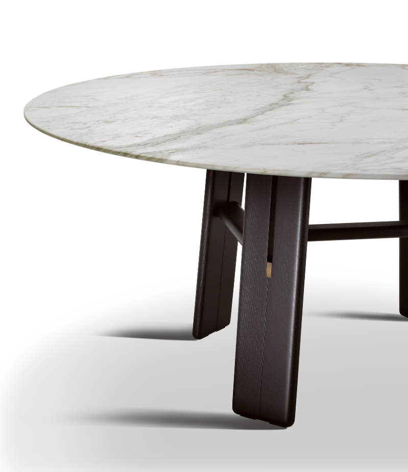Il solido basamento in legno massello di frassino tinto Wengé o Moka, recupera e rielabora lo stile e il disegno dei tavolini DUO senza esserne l’esatta trasposizione. Infatti, le gambe sono composte da grandi tavole a sezione rotonda inclinata e collegate tra loro da una crociata con elementi in ottone bronzato. Il basamento sorregge il top di forma rettangolare o circolare in marmo Calacatta. DUO Table è il primo esempio a catalogo per Ceccotti Collezioni di un tavolo con piano in marmo mono-lastra libero senza cornice in legno.