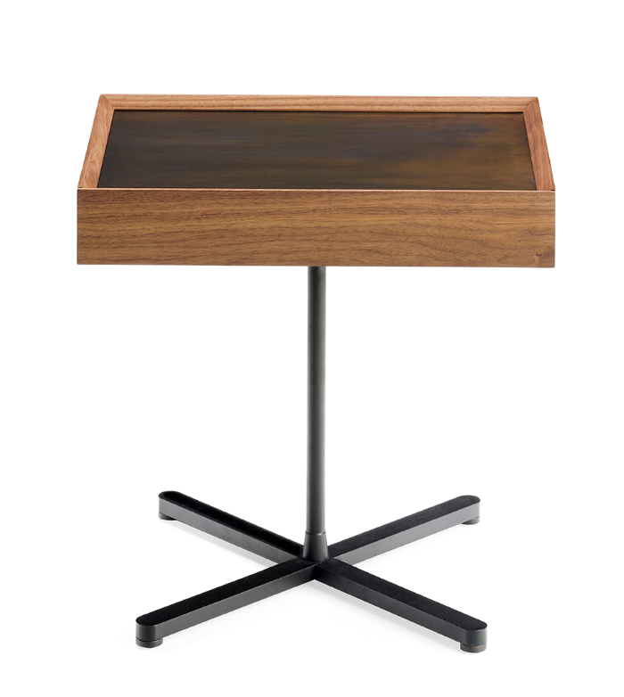 I nuovi tavolini Galimede disegnati da Giuseppe Casarosa interpretano le moderne esigenze abitative coniugando l’eleganza e la maestria artigiana di Ceccotti Collezioni con la necessità di organizzare e ottimizzare gli spazi in modo sempre più flessibile e dinamico. Galimede cassetto presenta un vano portaoggetti realizzato in noce americano accessibile mediante lo scorrimento del piano rettangolare in ottone brunito che funge da superficie d’appoggio. La struttura è in acciaio bronzato disponibile in due altezze.