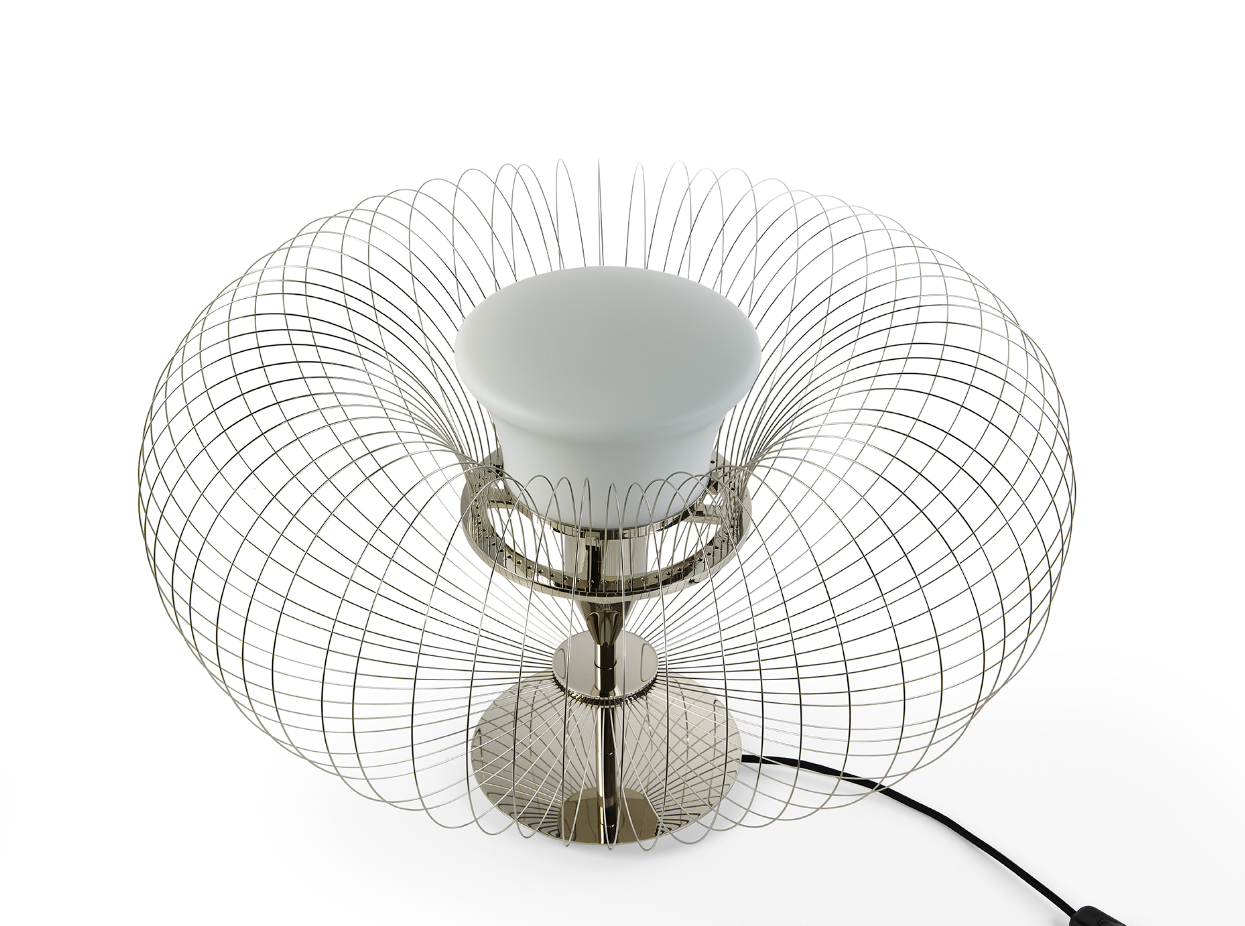 Steel Flower è una lampada da tavolo e terra in nichel lucido e acciaio. Essenziale e concettuale, ricrea la forma di un elemento naturale, il fiore, attraverso l’utilizzo di materiali industriali. Il paralume è in vetro bianco sabbiato e simula la parte centrale della pianta mentre intorno 64 fili in metallo sono ripiegati su sè stessi come a formare la corolla di petali.