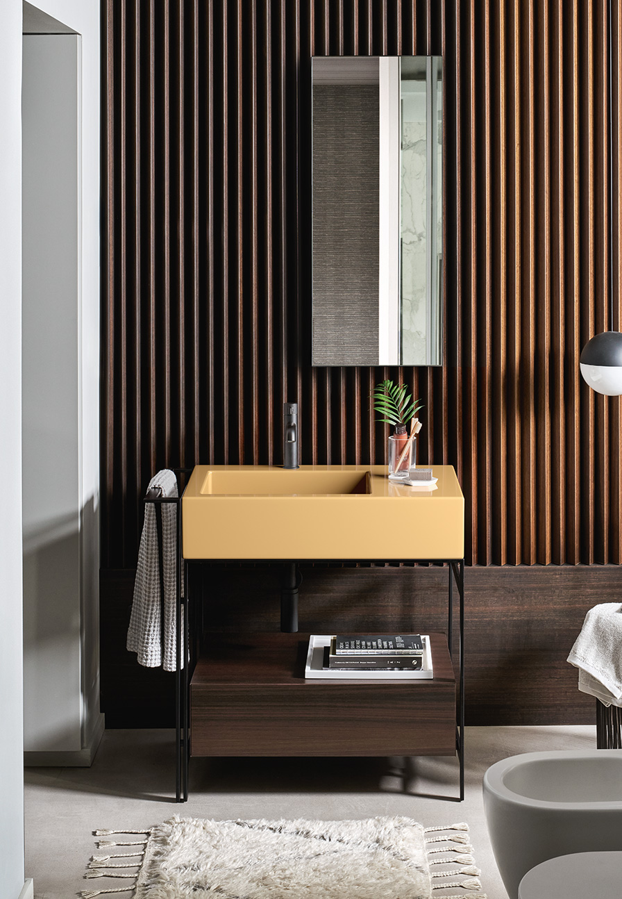 舒適洗臉盆的模塊化系統,帶側架,有多種飾面可供選擇。噴漆鋼結構可搭配實用的側毛巾架、同樣采用噴漆金屬的開放式物品架、漆木或木質飾面五斗柜和舒適的側邊皮革袋,或一個大矮抽屜,也可用作作為架子,有漆木或木質飾面可供選擇。實用的側邊皮革小袋完善了整個造型。