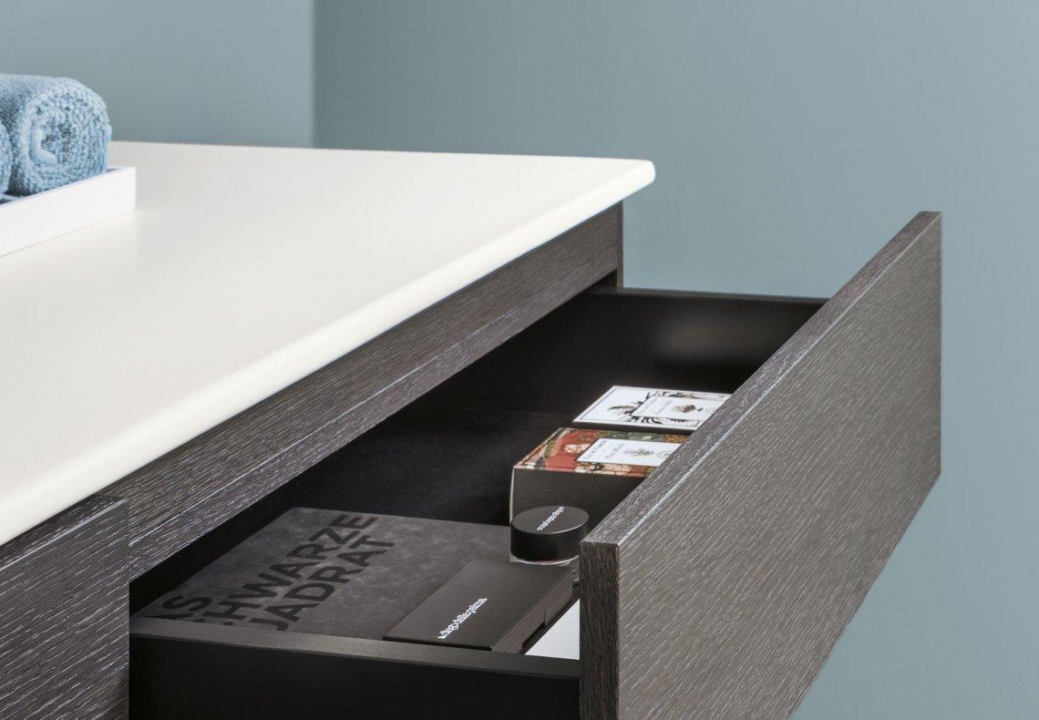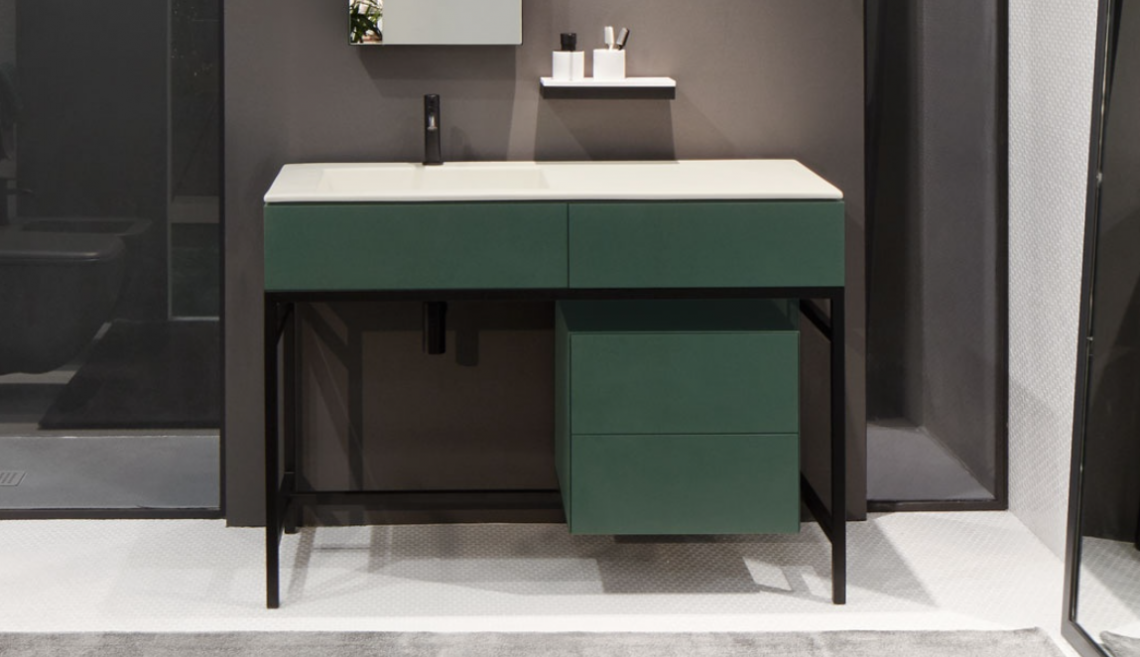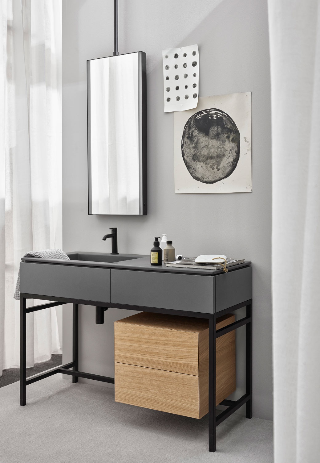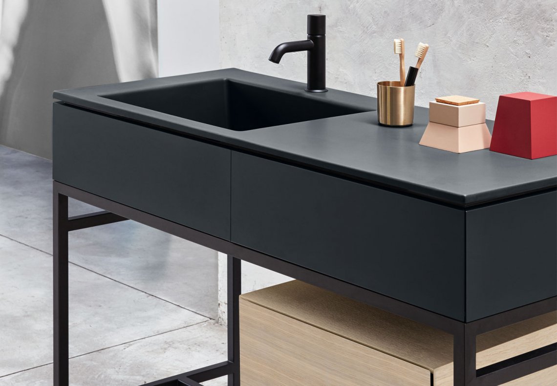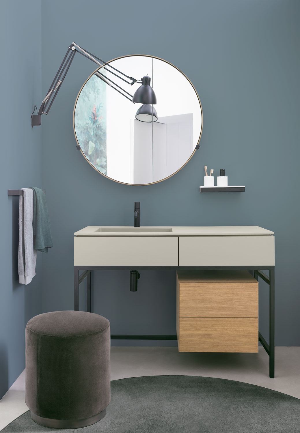 一個大盆和一個方便的臺面是純粹而必不可少的家具的特征,陶瓷臺面有 16 種顏色的 Terre di Cielo 系列或亮白色和一個儲物抽屜。框架由鋼制成,有啞光黑色、拉絲青銅色或鈦色可供選擇,可搭配木制或涂漆抽屜。