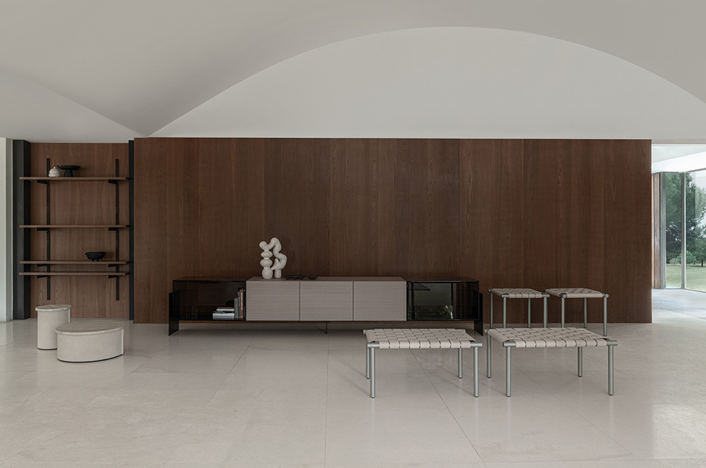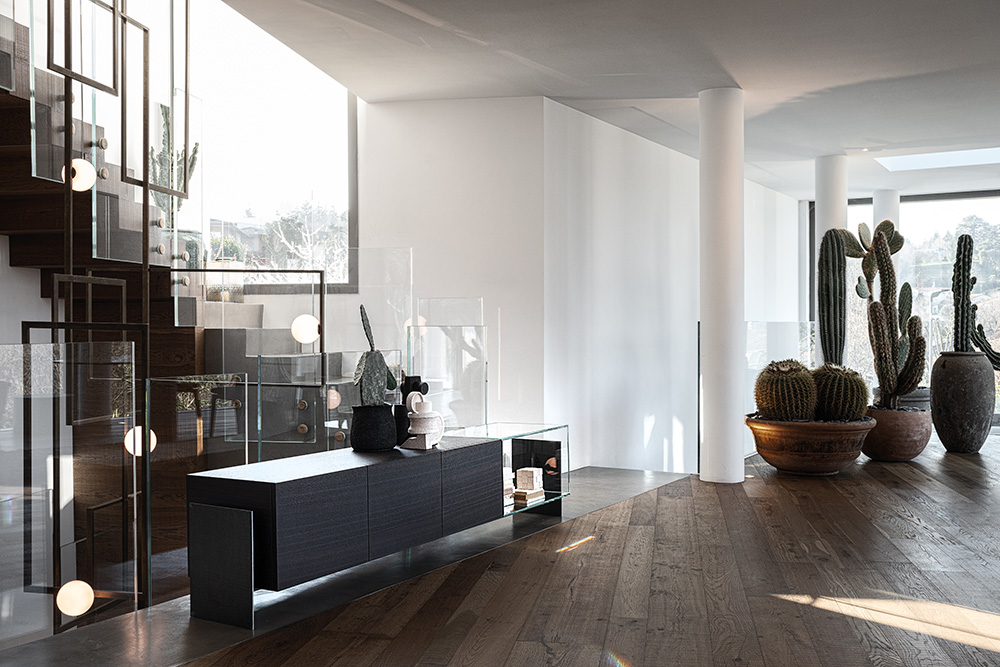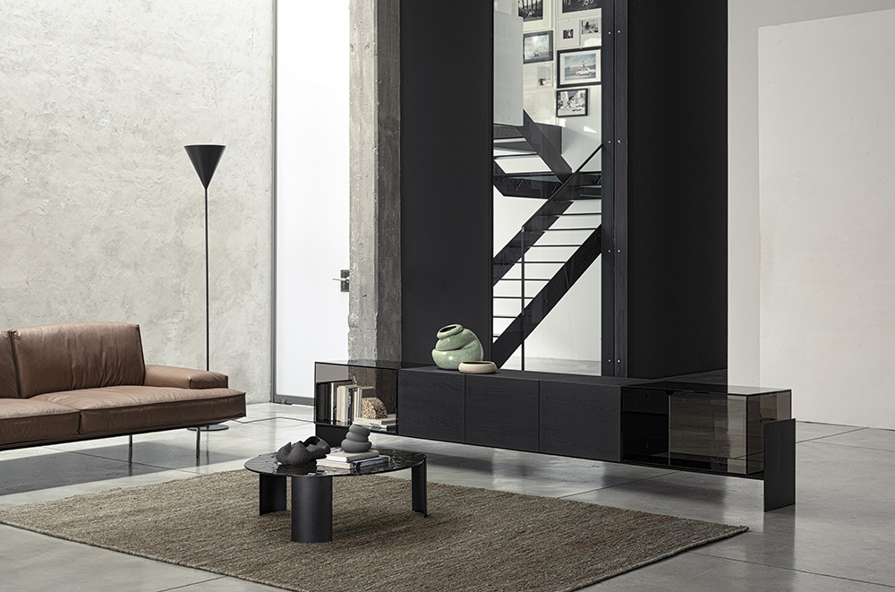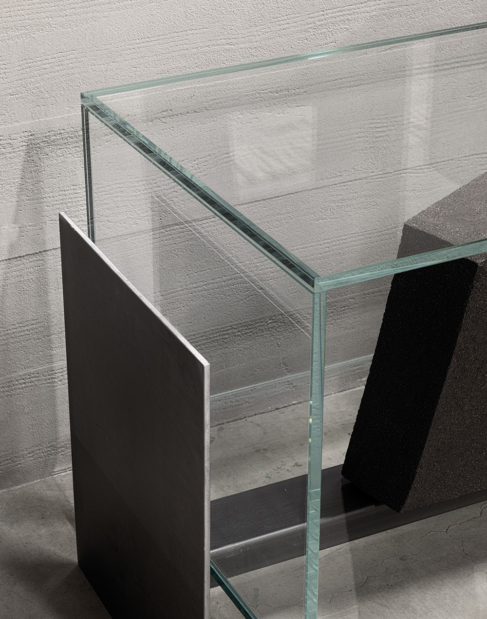 Wooden structure in multi-laminated wood with different finishes: veneered black ash wood or light Lati wood, gloss lacquered or matte lacquered available in different RAL colors: 9005, 3007, 6008 and 9002. Storage unit in glass: 5 closed sides with extra clear or bronze tinted toughened glass, 12 mm thick. Black painted metal base. Struttura in legno multi laminato disponibile con diverse finiture: impiallacciato in legno frassino nero o legno Lati chiaro oppure laccato lucido o opaco nei seguenti colori RAL: 9005, 3007, 6008 e 9002. Struttura in vetro: bussolotto chiuso su 5 lati in vetro extra chiaro temperato o bronzo, spessore 12 mm. Base in metallo verniciato nero.