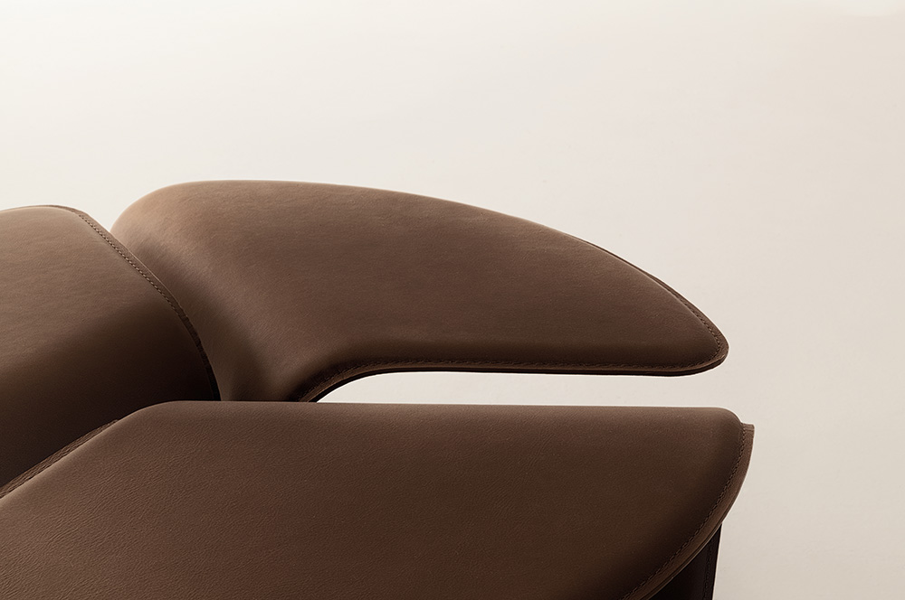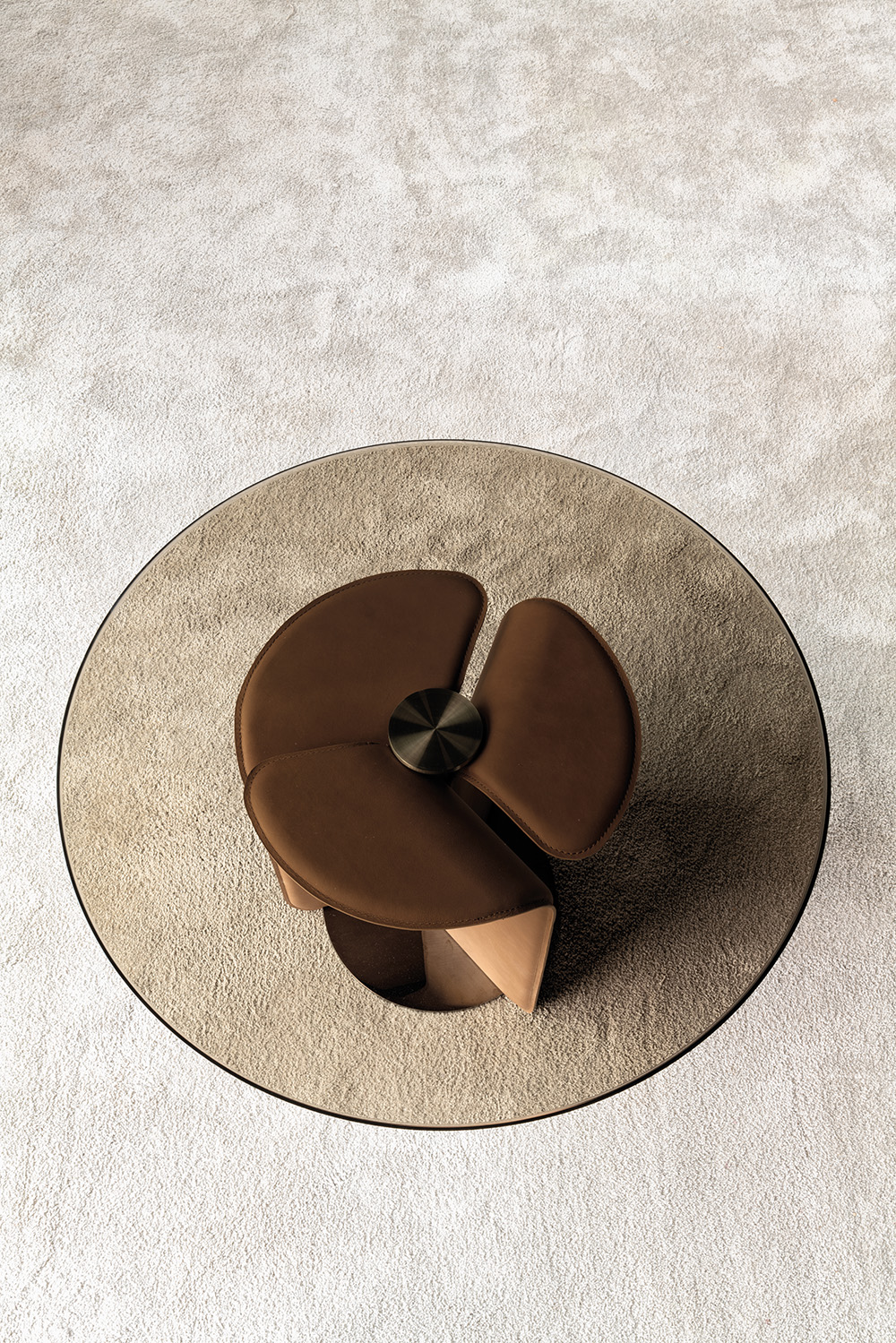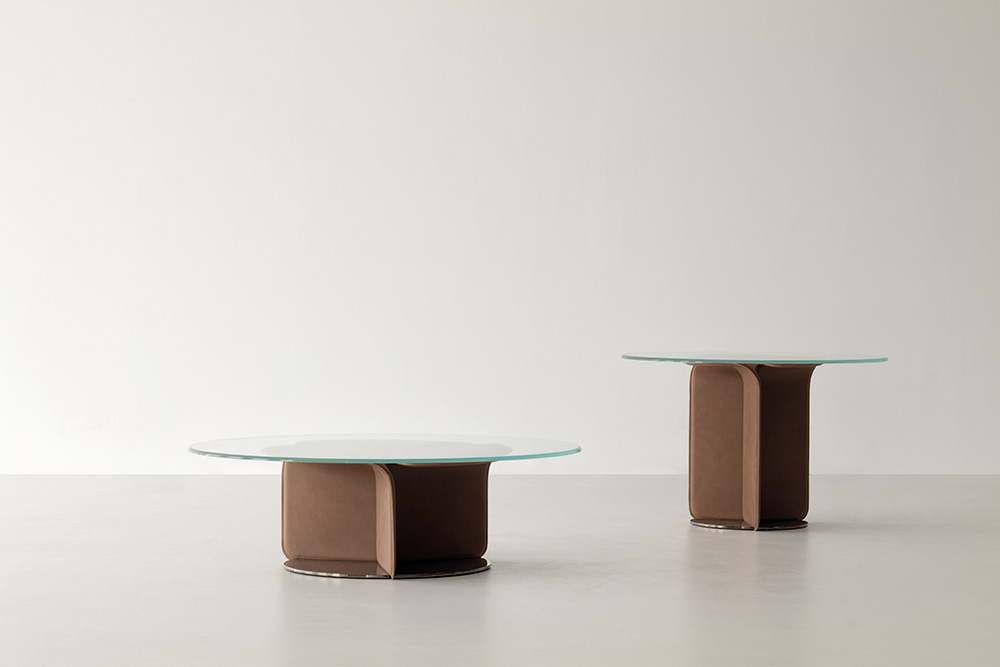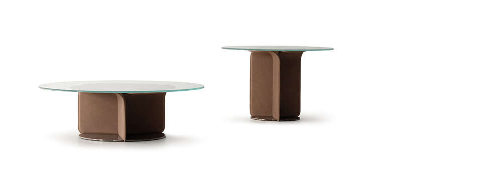 Helix coffee tables with glass top available in two finishes: extra clear and bronze. Metal base covered in leather with special raw cut edges finishing, available in three different leathers: Soffio, Setanil and Natural Velour. If no preference is specified, the edges feature tone-on-tone lacquering. Metal support plate available in bright chromed or black chromed finish.