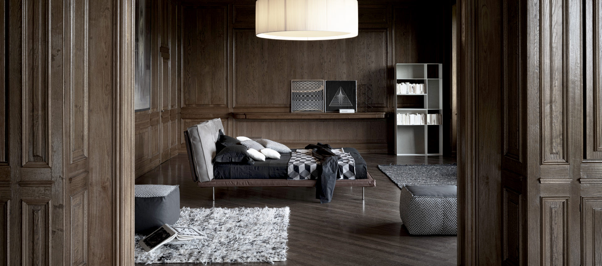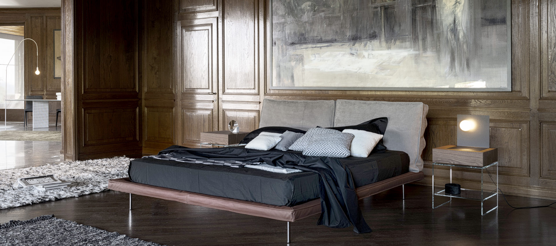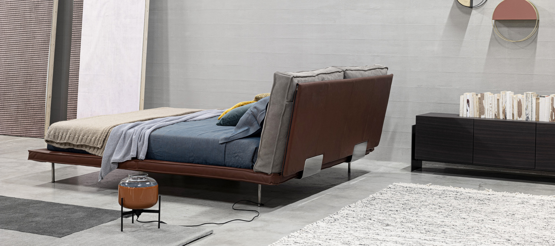 Headboard cushion in silicone-coated microfibre. The frame of the sommier is made of metal