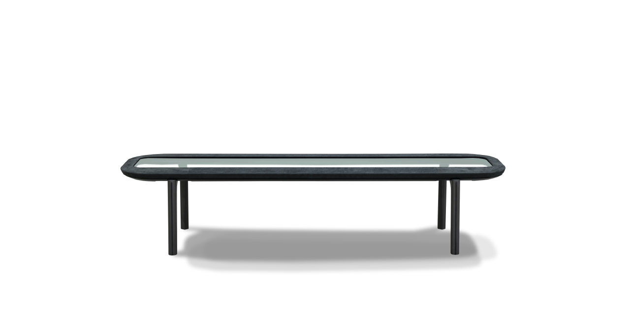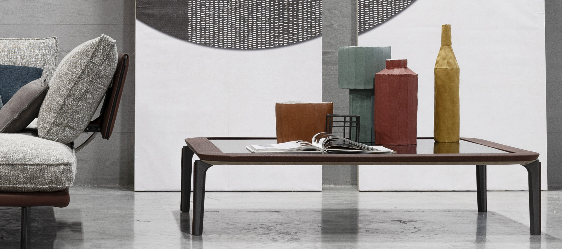 glass top surrounded by a worked leather frame. no edges for this rounded design coffee table. thin feet in painted wood with leather detail. a decidedly light and versatile line capable of combining different and complementary materials.