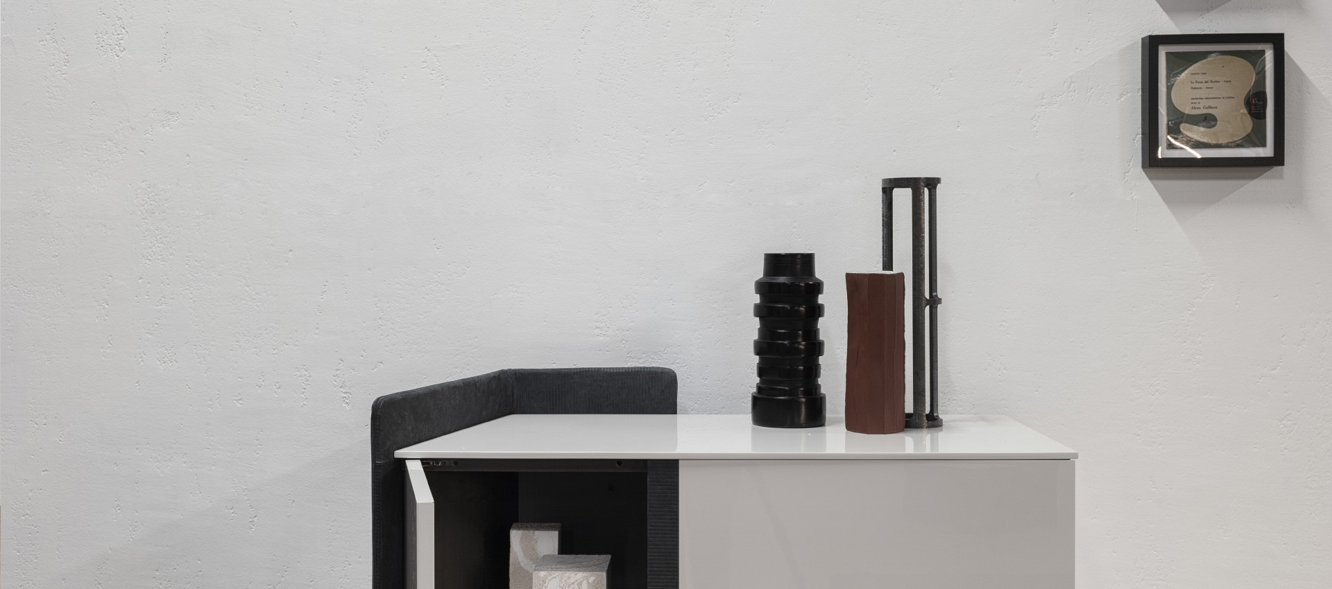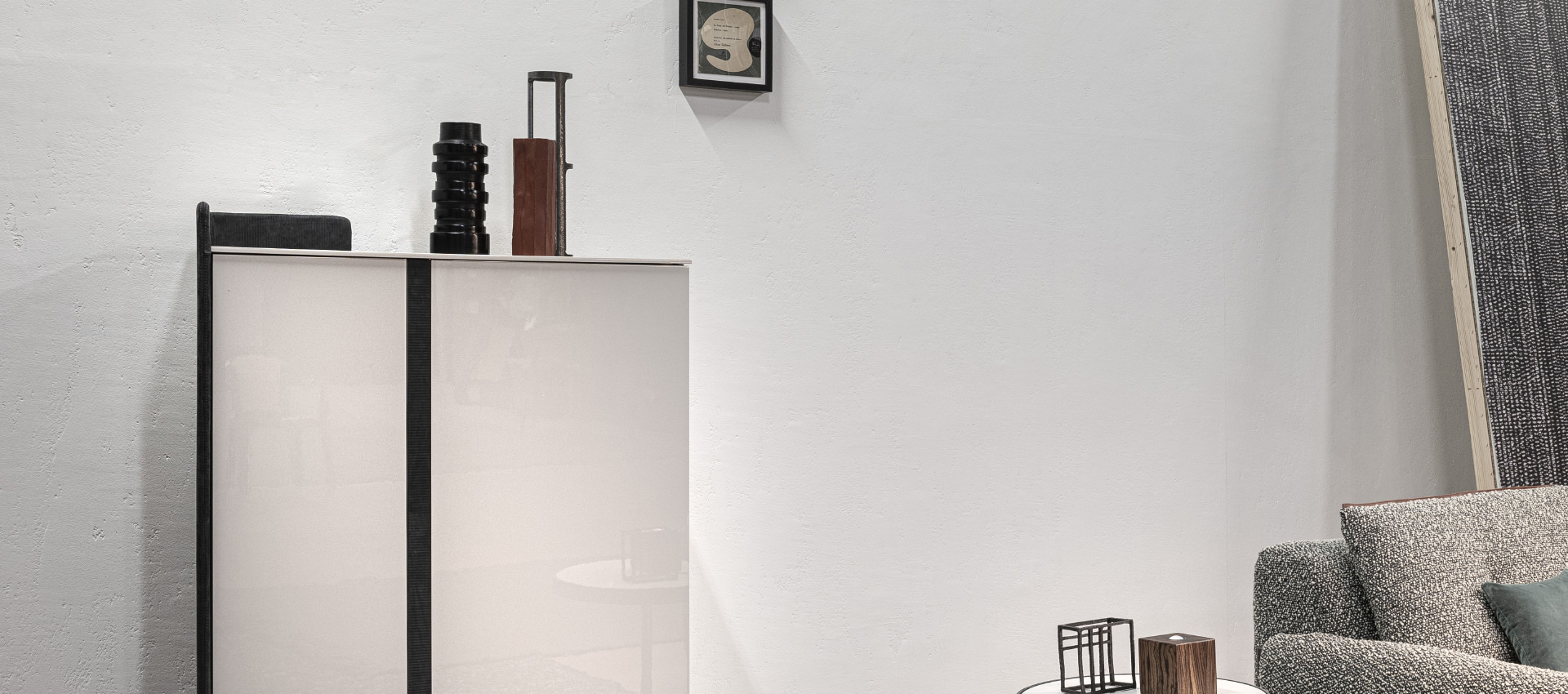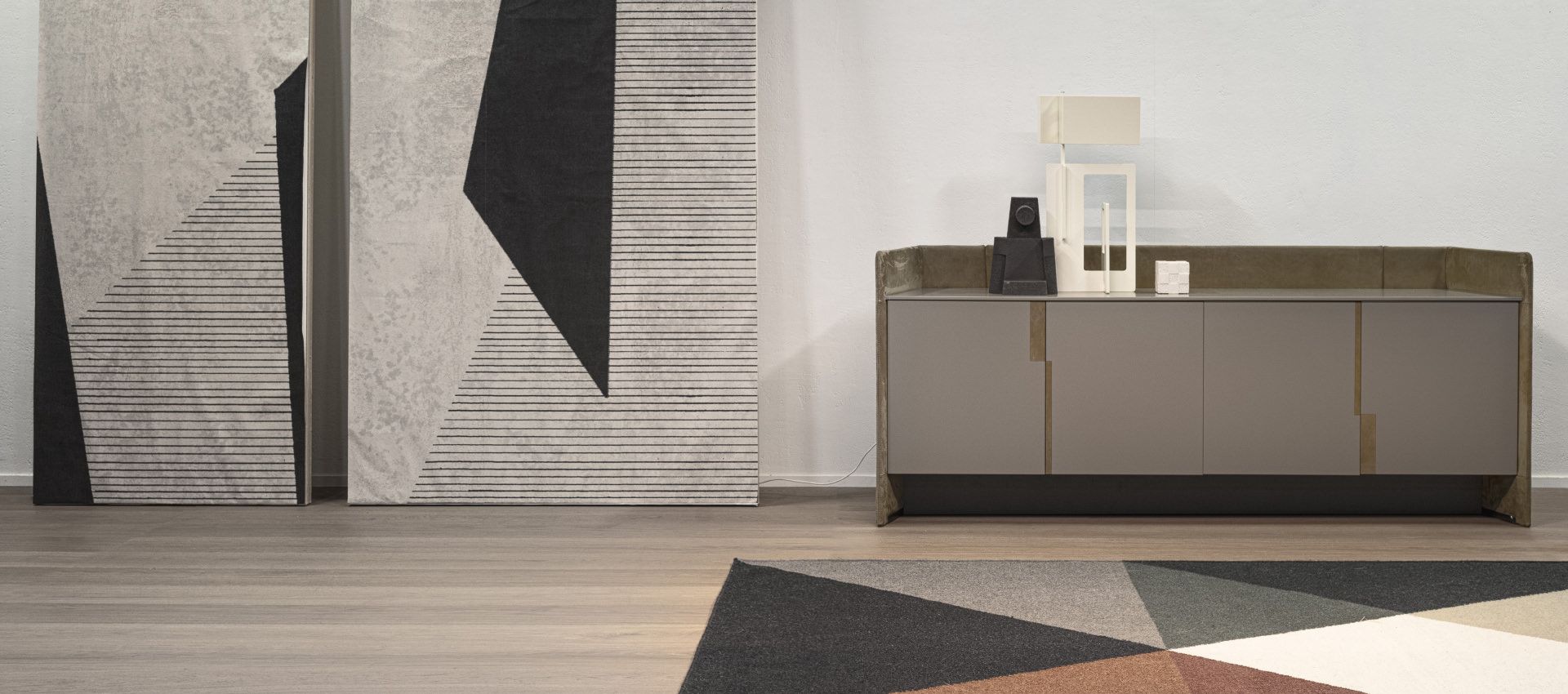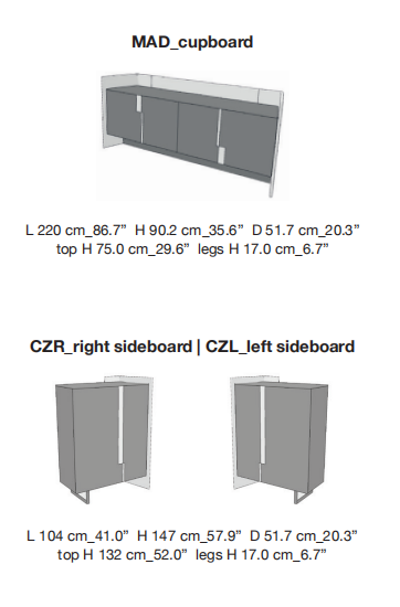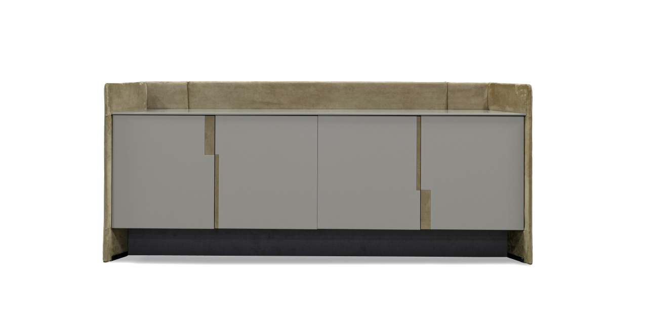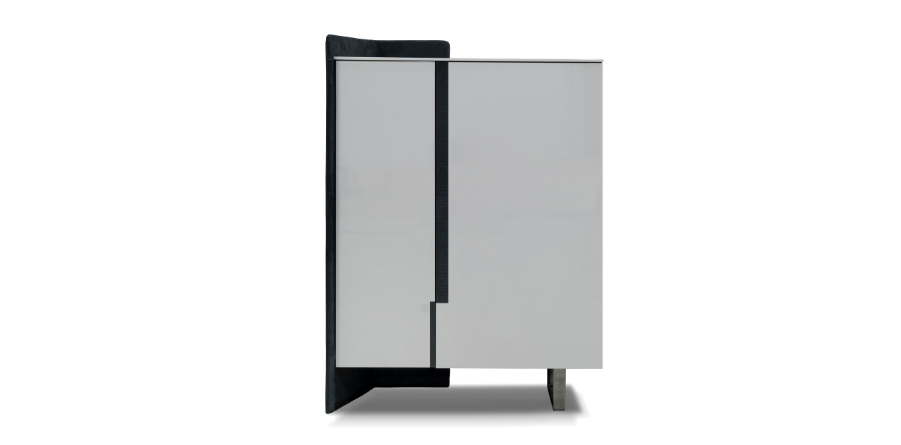 with visible stitching. Doors and top lacquered with glossy and matte finish. Handles