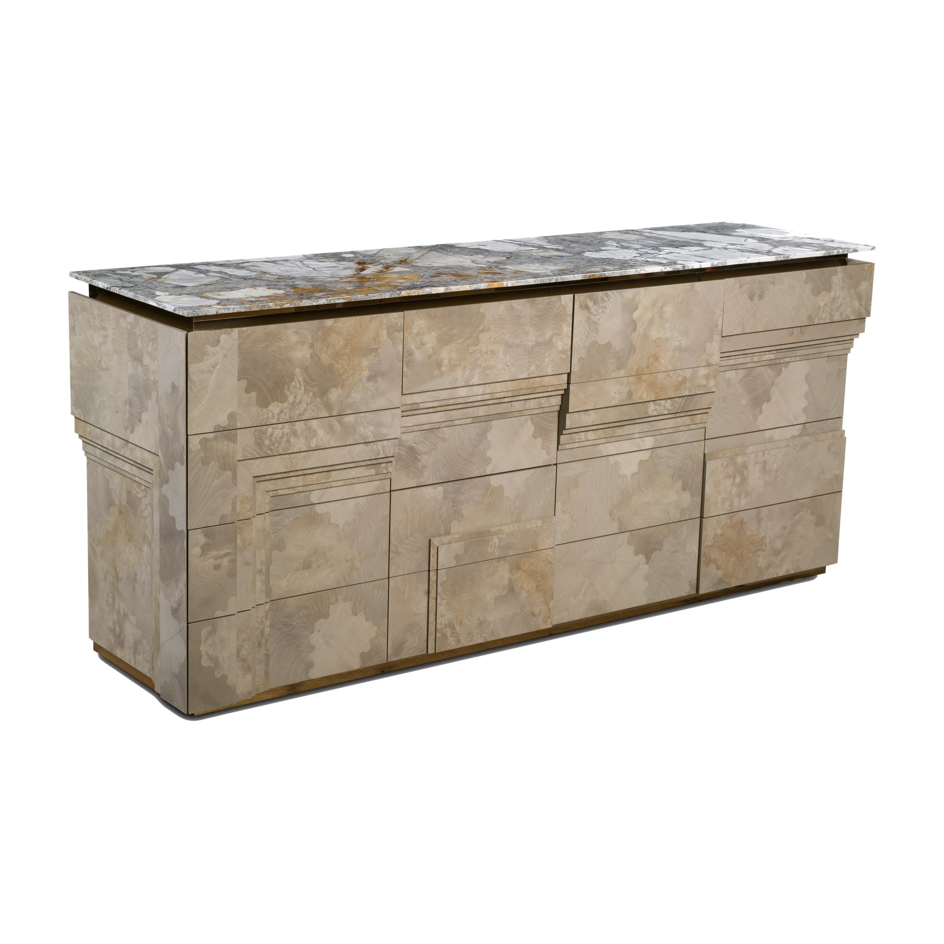 Struttura in legno listellare laccato. Interno cassetti laccati. Base in legno rivestito in metallo. Vetrina sul top.