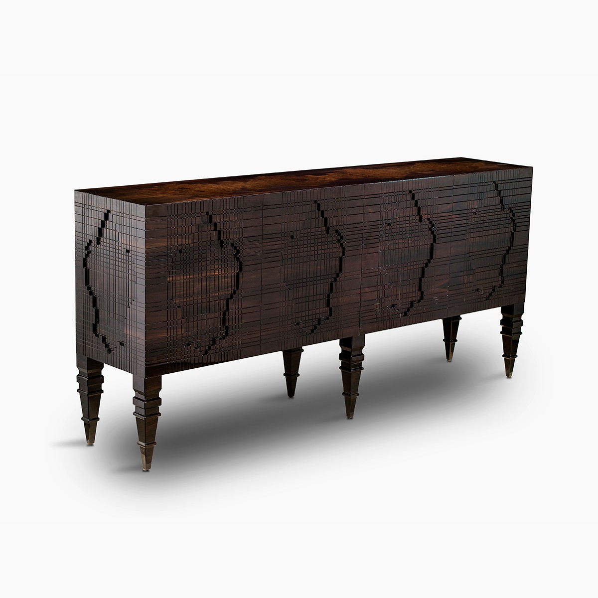 Struttura in legno listellare in finitura ebano lucido poliestere. Top con intarsio in radica Noce di Persia. Ante e pareti laterali decorate con incisioni in bassorilievo. Cassetti interni rivestiti in cuoio. Puntali in ottone.