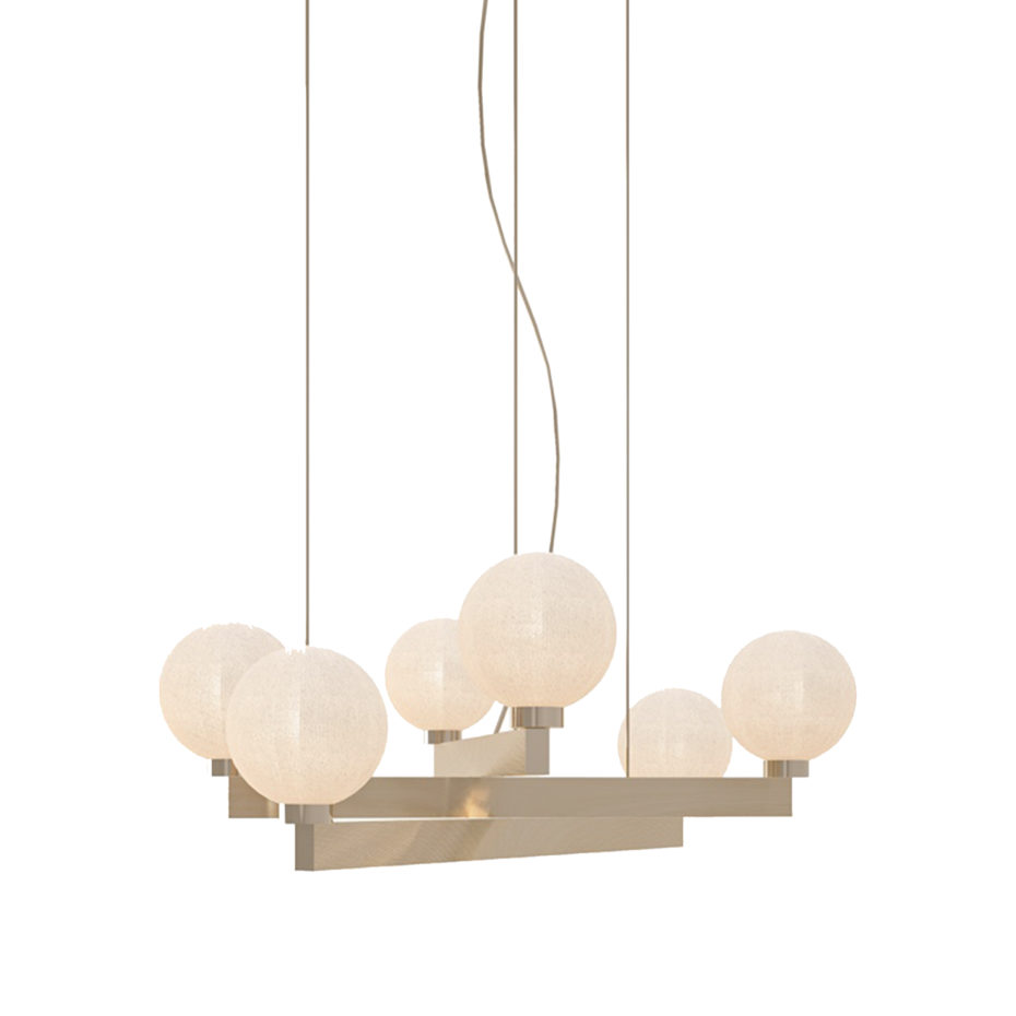 Struttura metallica. Sfera in vetro opale. Cavo in maglia metallica finitura bronzo. Lampadine LED G9 220 volt.