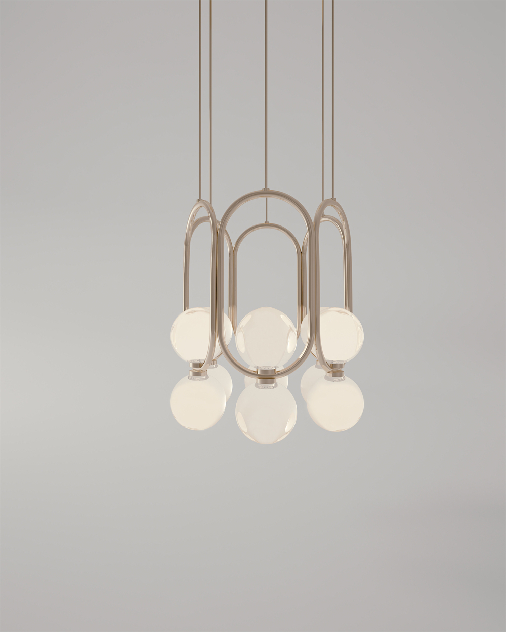 Struttura tubolare metallica. Sfere in vetro opale. Cavo in maglia metallica finitura bronzo. Lampadina LED G9 220 volt.