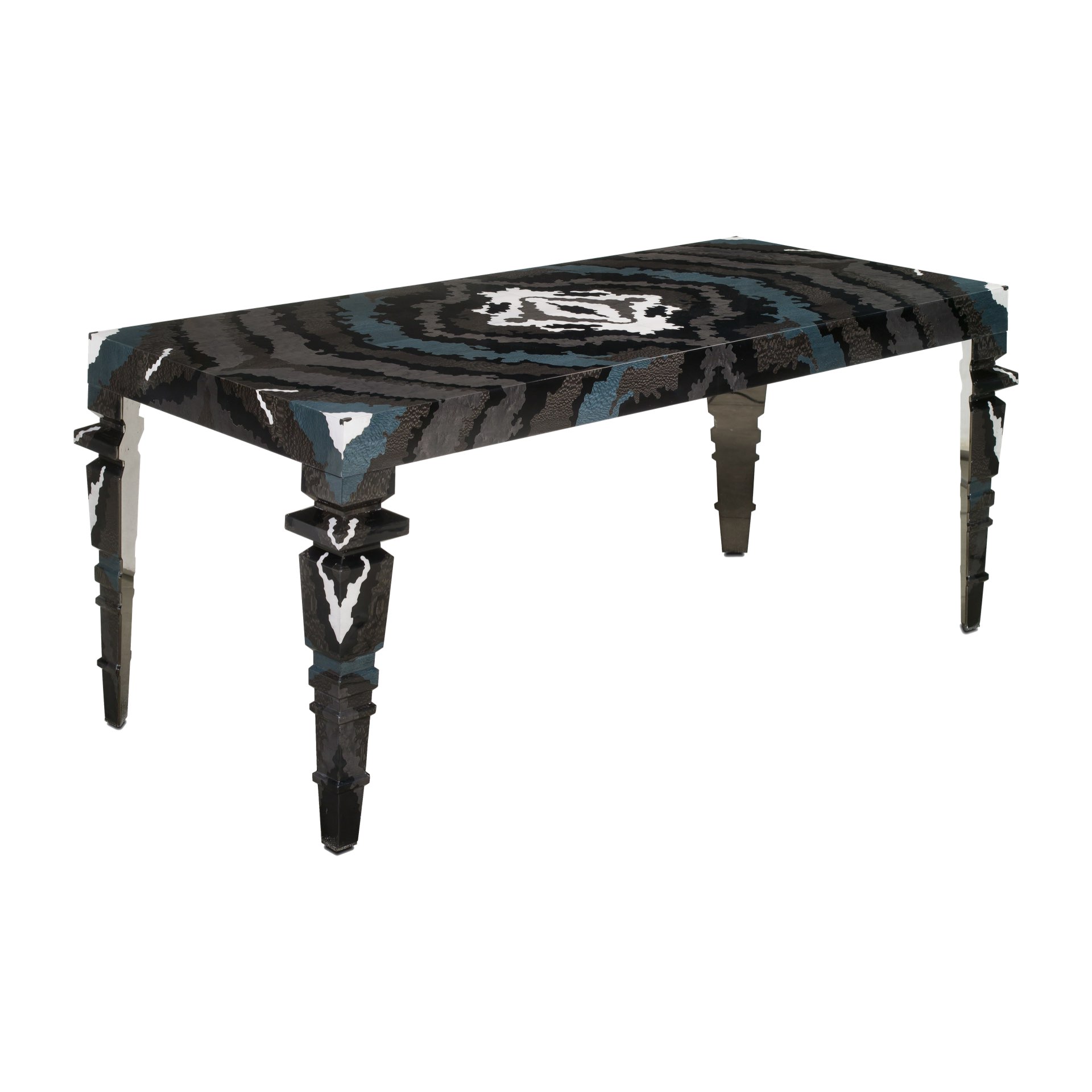 in alluminio. Gambe in marmo tagliate a 45°. Interno gamba e puntale in acciaio a specchio. Interno cassetti laccato.