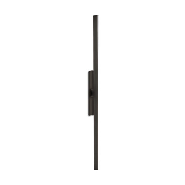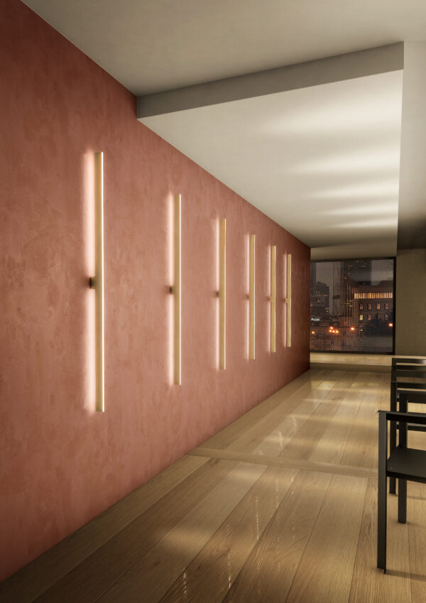 Il profilo luminoso di Fly, disponibile nelle finiture nickel dorato satinato, bronzo-nickel spazzolato e antracite, grazie all'accessorio "vela" può essere delicatamente ombreggiata da un diffusore tessile in cotone bianco o tessuto effetto marmo Calacatta.