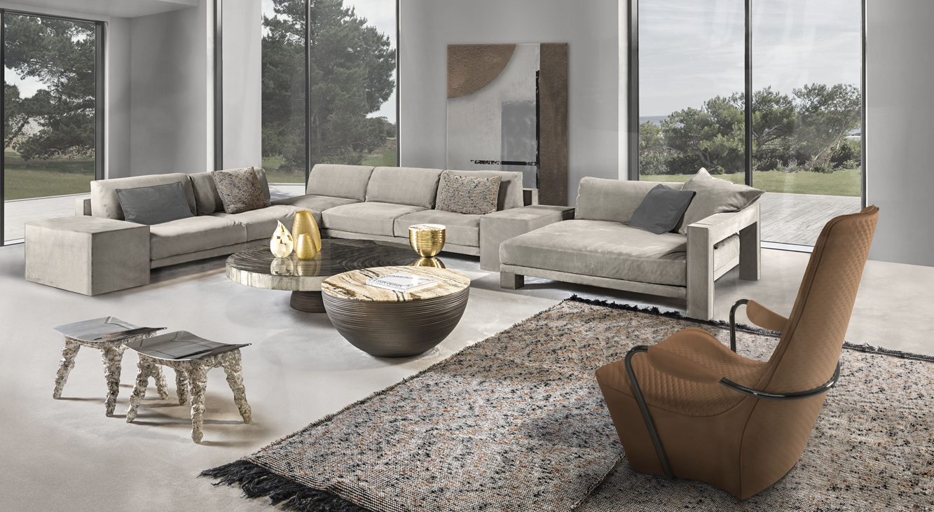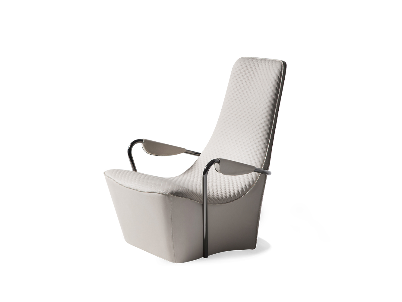 Comfortable and elegant, Wave armchair has found its inspiration in “bergere” armchairs very popular during the first half of last century. Its lines appear very contemporary and they are defined by a tubular metal element that envelops the entire structure and becomes functional as armrest on both sides. Fabrics and leathers used as upholstery are decorated with a “dot” pattern embroidery able to enhance a great comfort. Its ergonomic and refined shape conveys a meditative feeling.