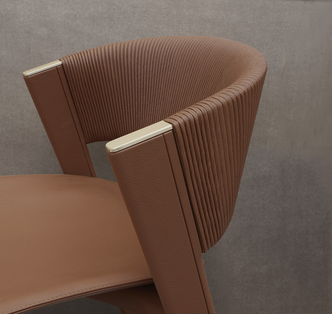 Designed to be matched with Nova table, Lisbona chair is suitable also for other tables placed in different living areas: the look of this item is refined and its proportions have been thought to grant the best comfort. The front legs are realized with maple tree wood lacquered with dark brown colour while the frame and back legs upholstered with leather, present refined brushed metal details on the upper part. The back legs,a bit reclined internally, sustain an enveloping leather back embroidered with “plissè” effect while the seat, that is upholstered too, exalts the shape of this chair showing the cross detail that joins the legs.