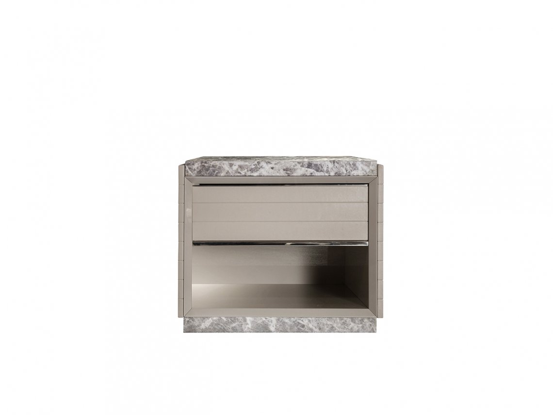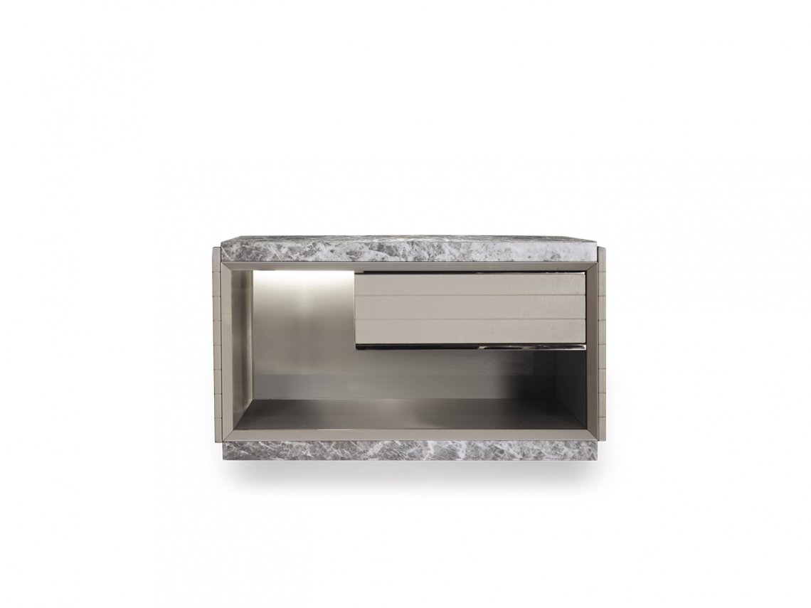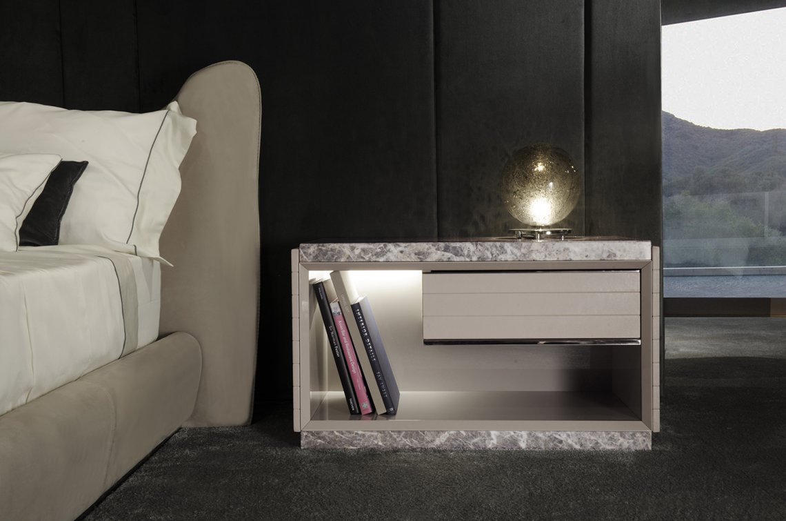 The night table Morfeo has essential design particularly indicated in a sleeping area with an elegant formal rigour. Larger than the standard model it provides an open space that can accommodate a series of books or objects of different size. The drawer is positioned on the right or left side of the night table, this creating a fairly unfamiliar design for a sleeping area. A series of parallel horizontal engravings mark all the elements forming the external part and represent the distinctive element of this piece. The lacquered open compartment is available in trendy colours easy to match with themarbles used for the top and the base on the ground. The night table has a led light in the open compartment.