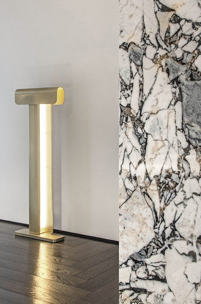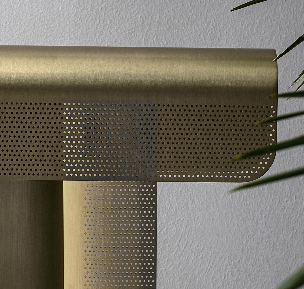 Floor lamp Florence represents the embrace of two metal leaves that bend both on themselves and one onto the other, creating an extremely refined and harmonious shape. The light comes out from small holes arranged on the surface making this element one of the protagonists of a living area.